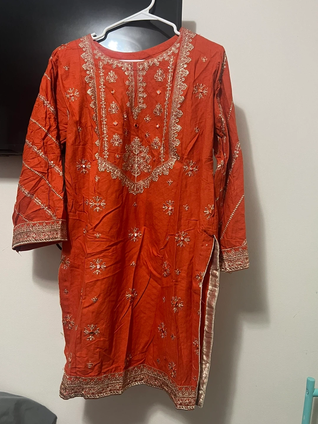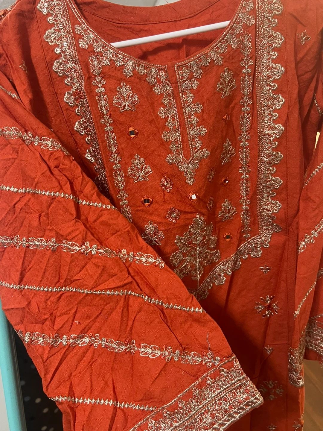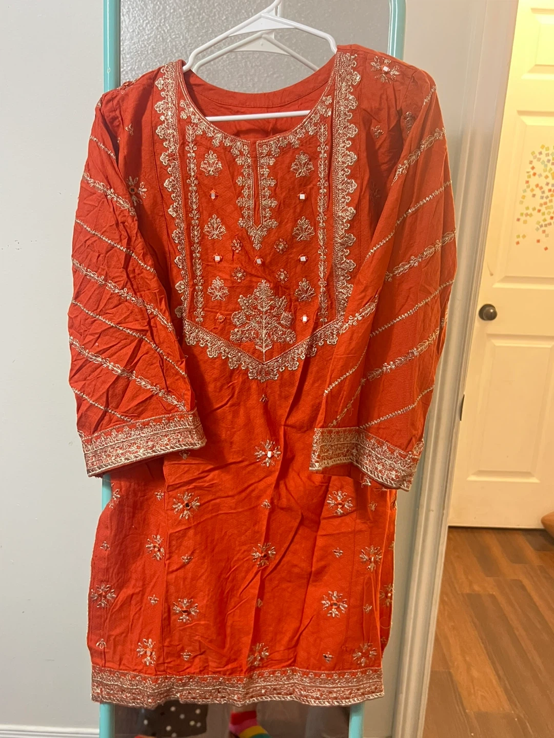 Beautiful orange kurti with intricate silver embroidery. It's in great condition and ready for a new wardrobe!