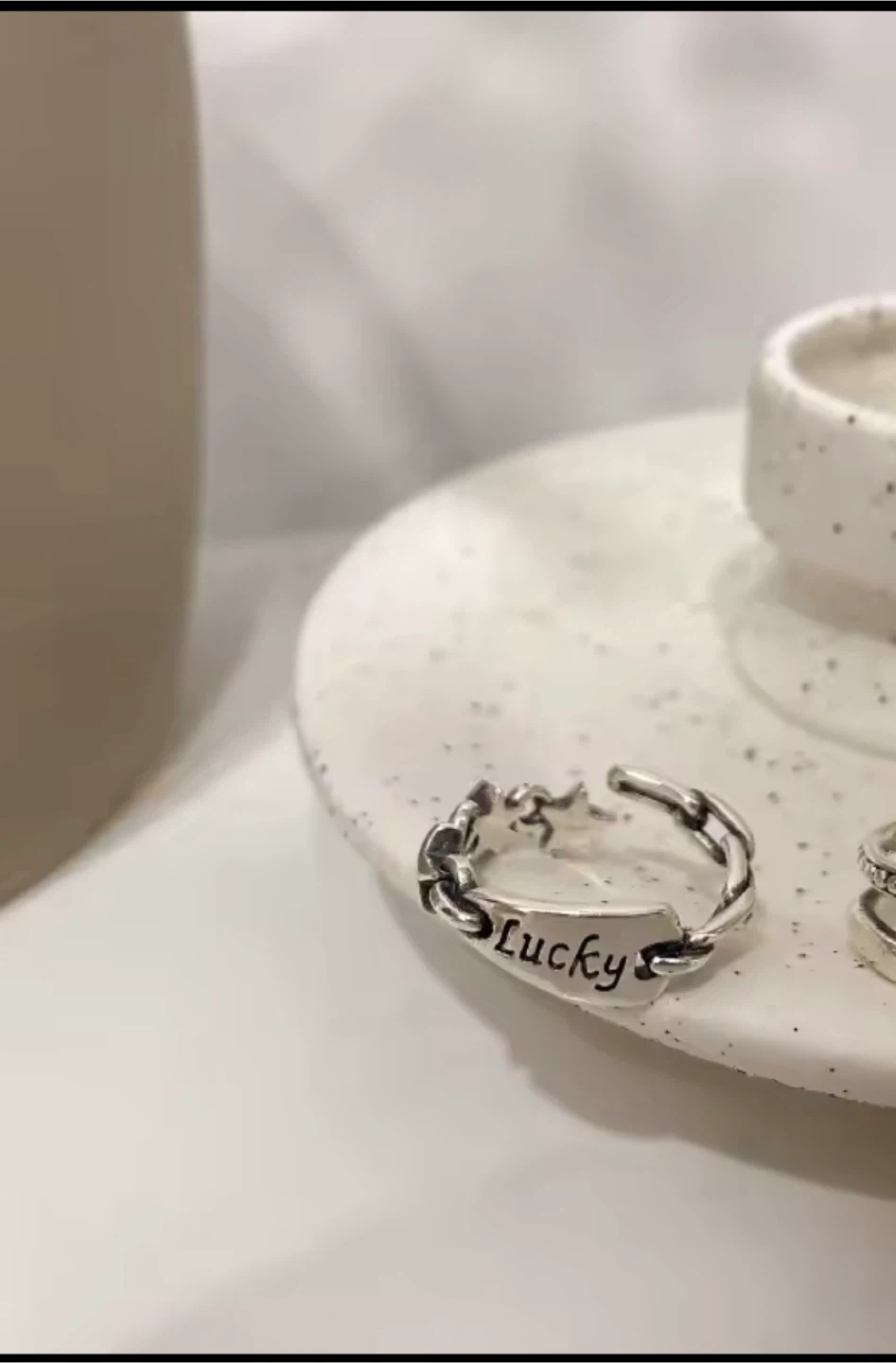 Selling a cute 925 silver ring with a chain design and the word 'Lucky' on it. It's in great condition and would be a lovely addition to your jewellery collection!