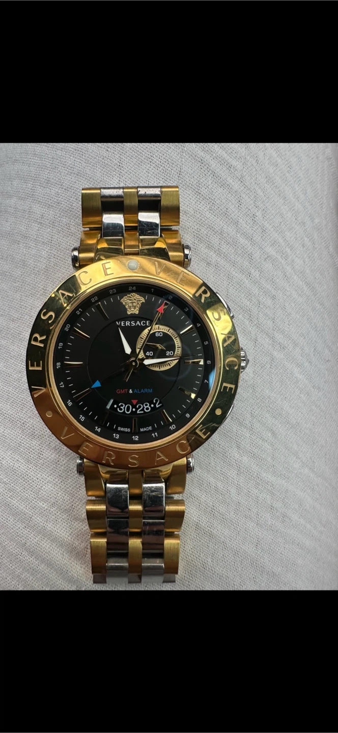 Selling a Versace watch with a two-tone gold and silver band. It features a black dial with GMT & Alarm functions. The watch has the Versace logo prominently displayed around the bezel. Swiss Made.