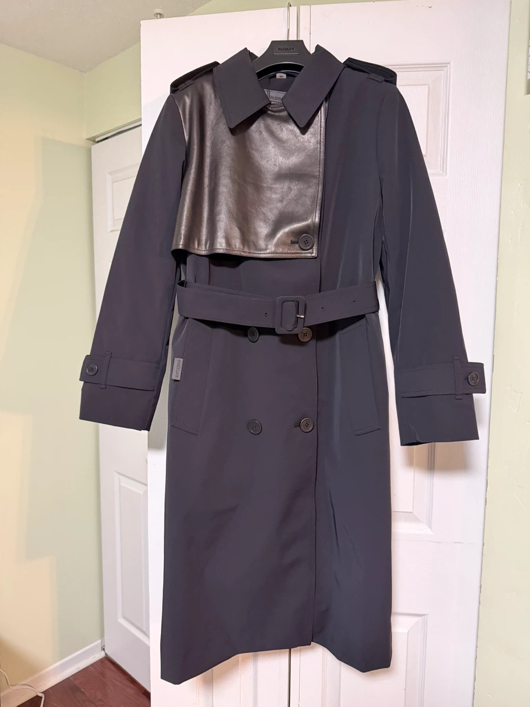 BRAND NEW - water repellent RUDSAK trench coat with real leather trims. It's designed for warmth with an inner puffer lining, suitable for temperatures down to -10°C (14°F). The inner lining is also removable.