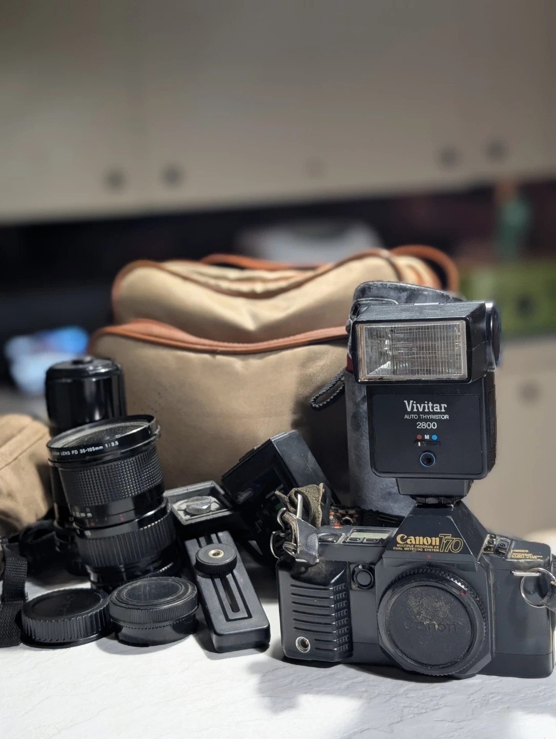 Selling a Canon T70 vintage camera. It comes with a Vivitar Auto Thyristor 2800 flash and several lenses. Great for photography enthusiasts!
