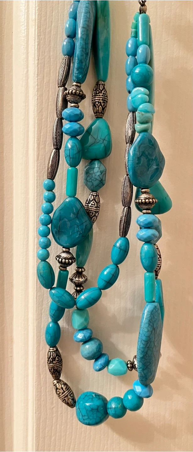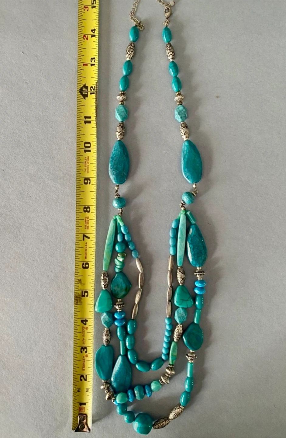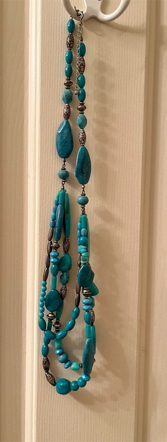 This is a lovely turquoise beaded necklace. The beads are various shapes and sizes, and the necklace is approximately 15 inches long.