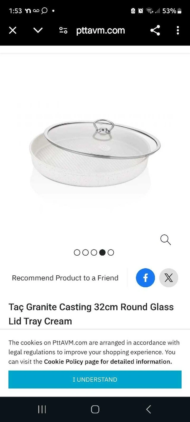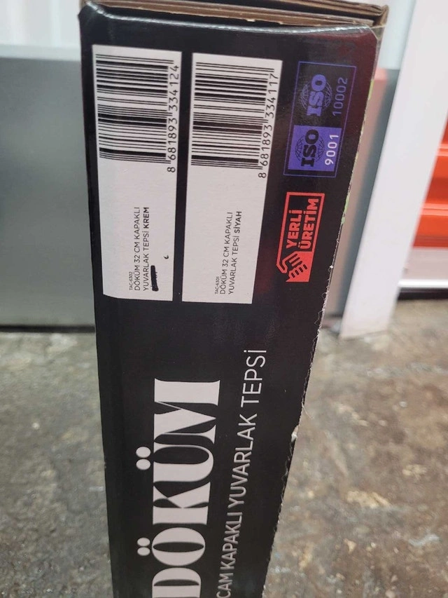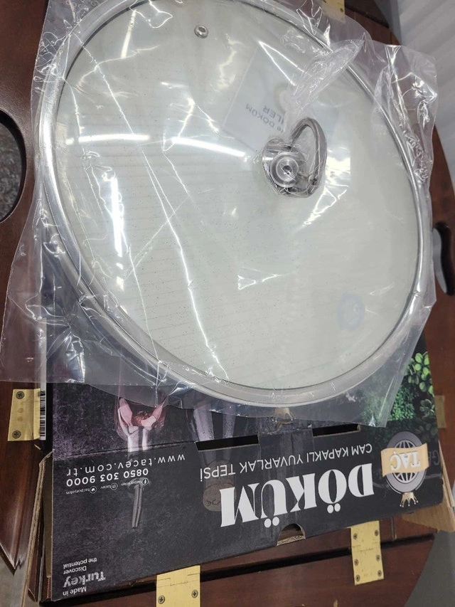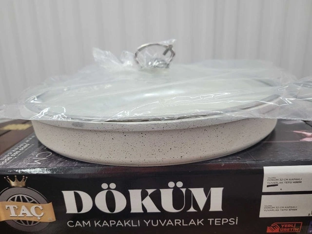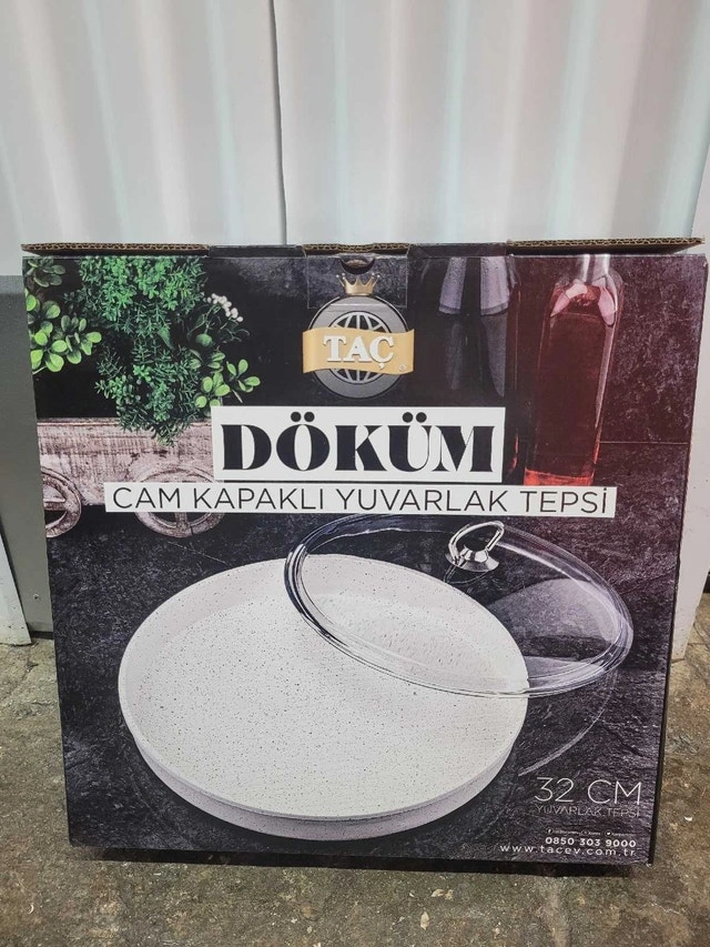 Brand new in open box. 32cm or 12.6" diameter. This granite casting grill pan is dishwasher safe, oven safe, and can also be used on gas or electric stovetop. Comes with a glass pan cover (not oven safe) for stovetop use.