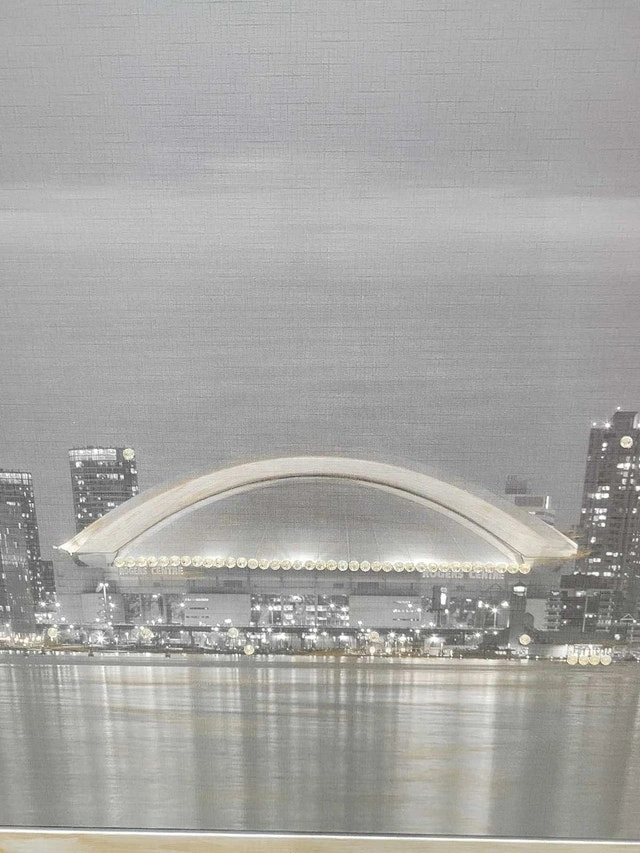 Toronto Skyline, IKEA MYRARP picture frame, with beautiful small white stones embossed to appear like light is emitted from iconic buildings, including the CN Tower. Dimensions: 55½" length x 40" height x 1" thickness.