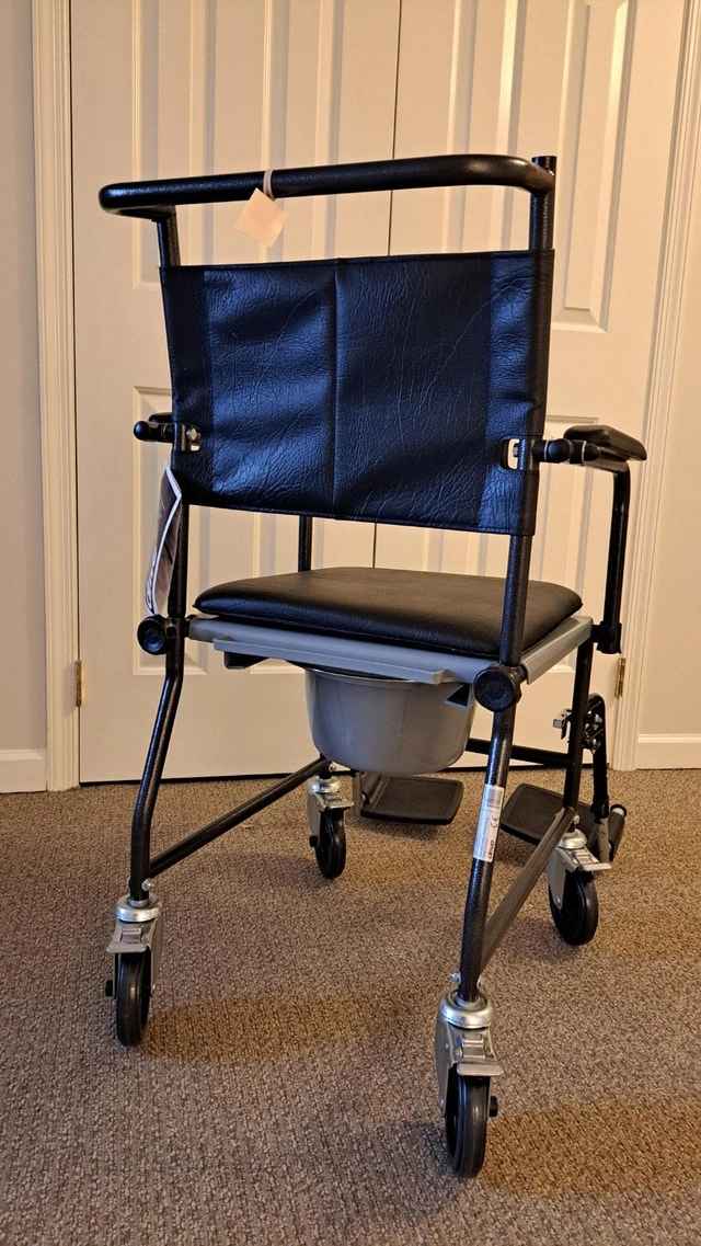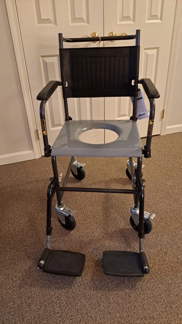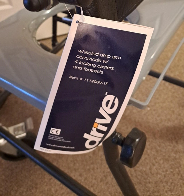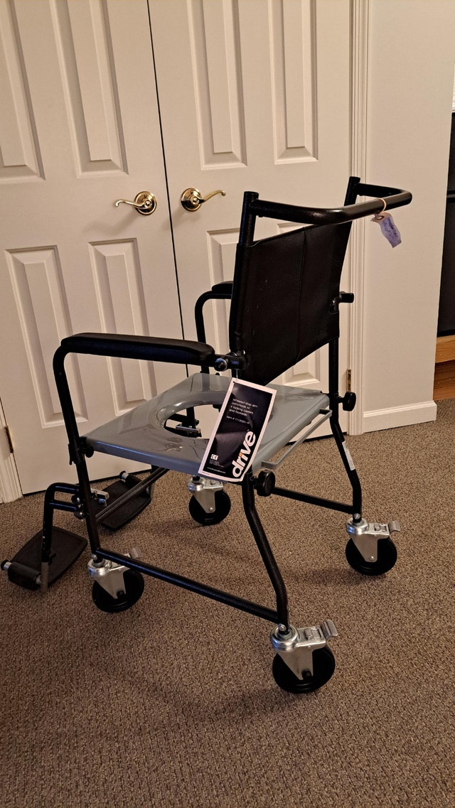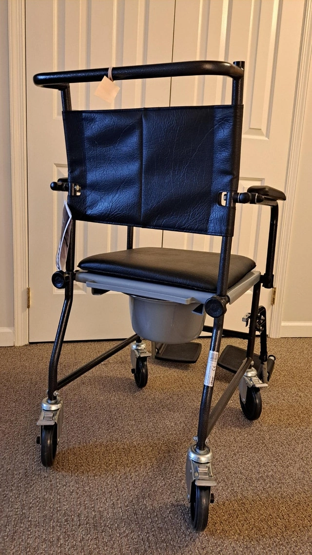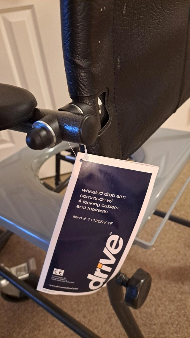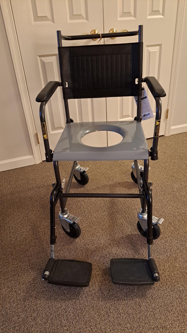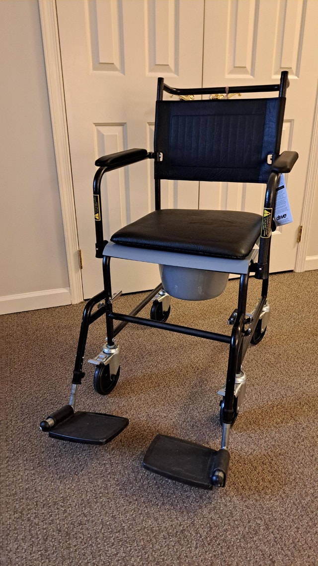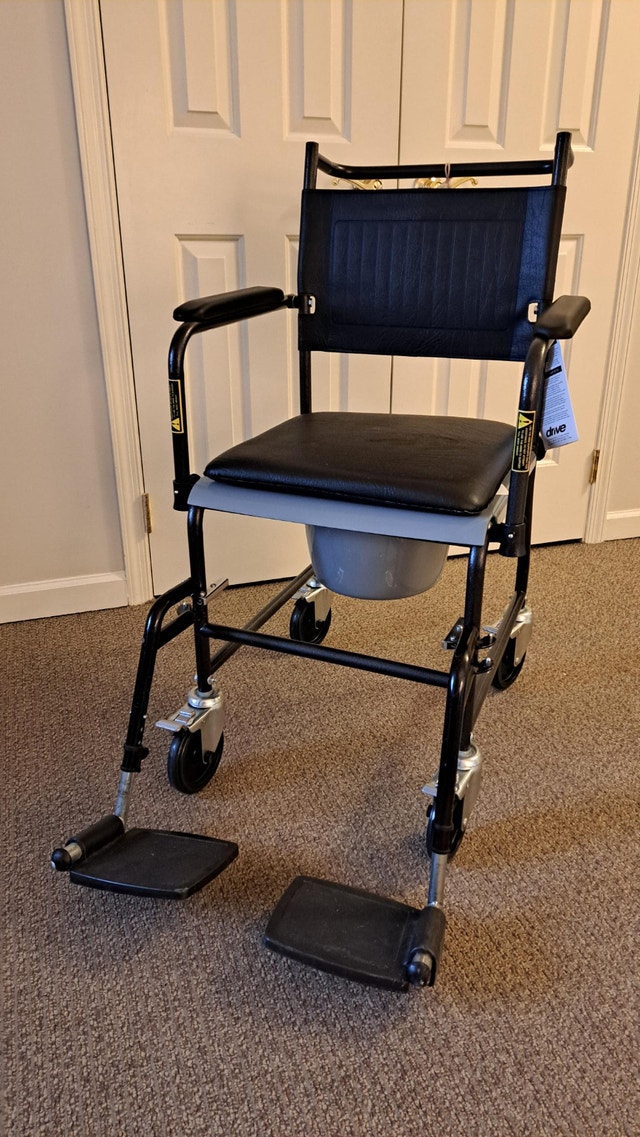A nearly new commode chair. It's an Upholstered Drop Arm Wheeled Commode, by Drive Medical. Item #: 11120SV-1F. Paid $410.00, asking $150, pick up in Richmond Hill. Used a few times, mostly as a shower chair. Collection pan was never used. Here are the specs: Simple, tool-free assembly Fully knock-down for easy storage and transport Drop-arms allow for easier lateral transfers Swing-away detachable footrests Collection pan included secures underneath the seat and can be easily removed from the backside of the unit Comfortable, wide backrest Durable and easy-to-clean padded vinyl seat cover