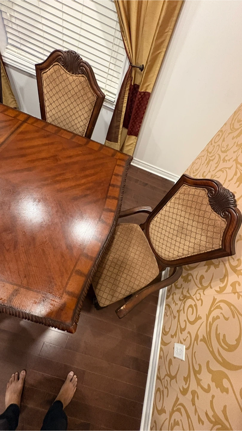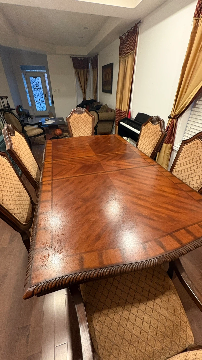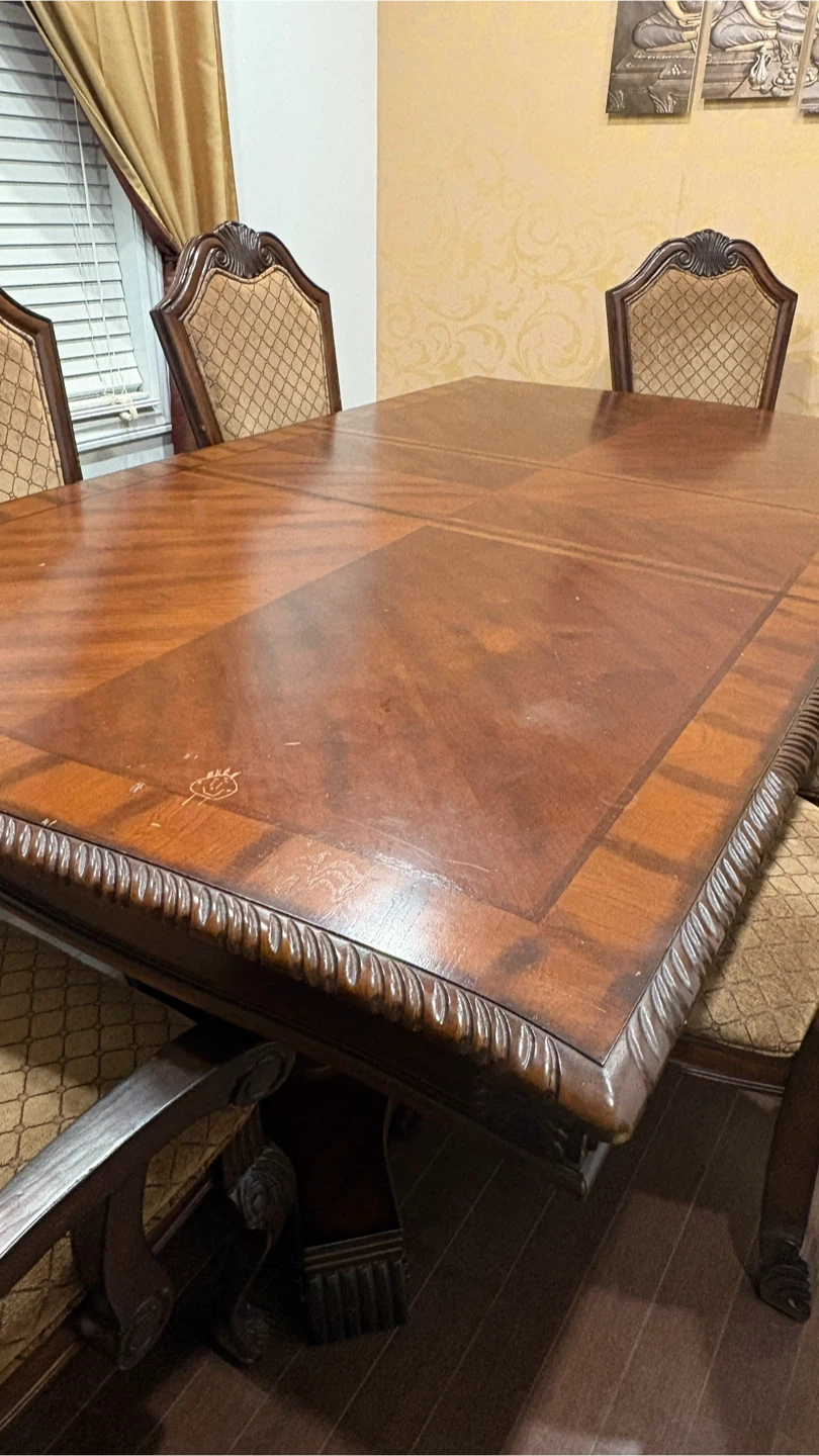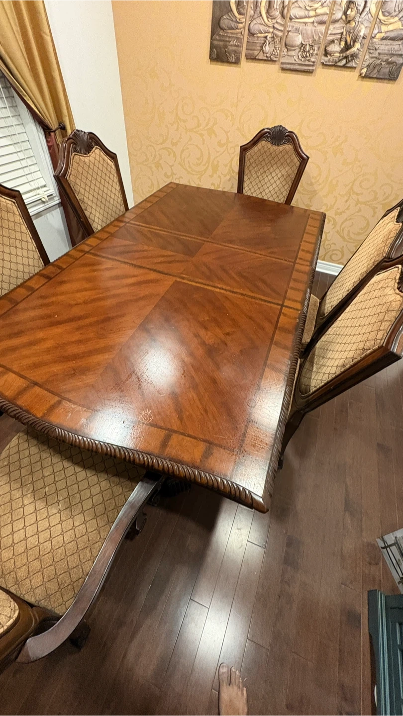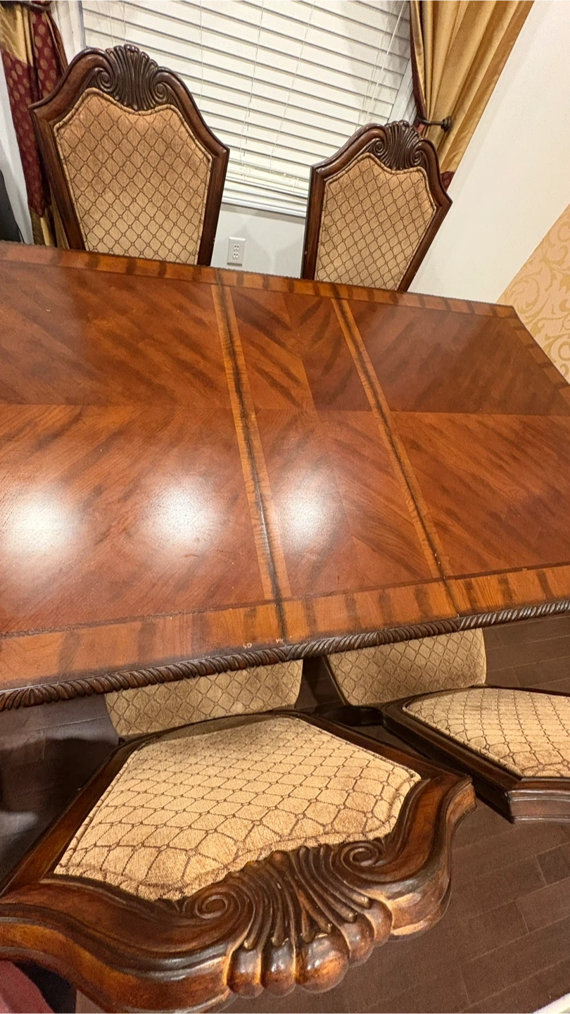 Selling a beautiful dining table set. It features a dark wood finish with ornate detailing on the table edges and chair backs. The table top has some scratches. The chairs have patterned fabric seats and backs. It's a lovely set for family dinners or entertaining guests!