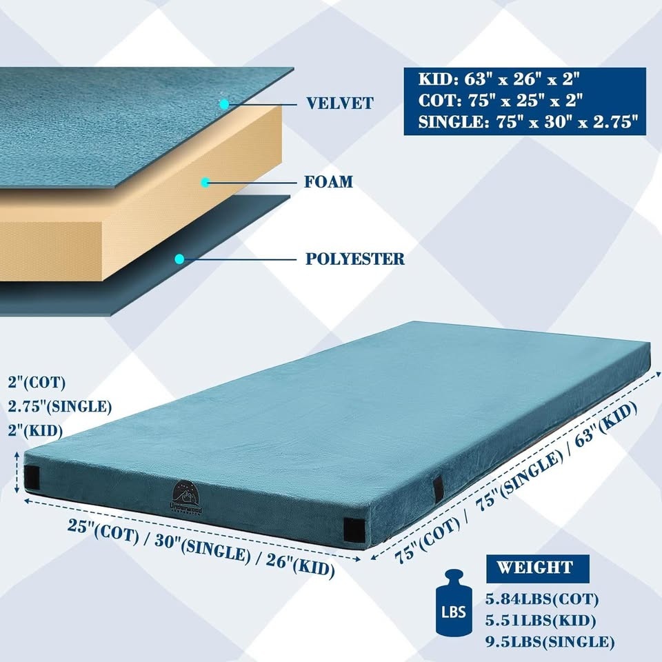 2 inch thick foam pad offers firm, comfortable support. Size 75 x 25 x 2 inches, about 5.8 lbs. Works on cots, tents, floors, beds, trucks, vans, and SUVs. Corner straps help keep pad in place on camping cots. Foam insulation with R value of 5 for cold or uneven ground. Removable, machine washable cover. Comes with carrying bag. Rolls up with straps for easy carrying. Simple, comfortable sleeping pad for camping, travel, or extra sleeping space at home.
