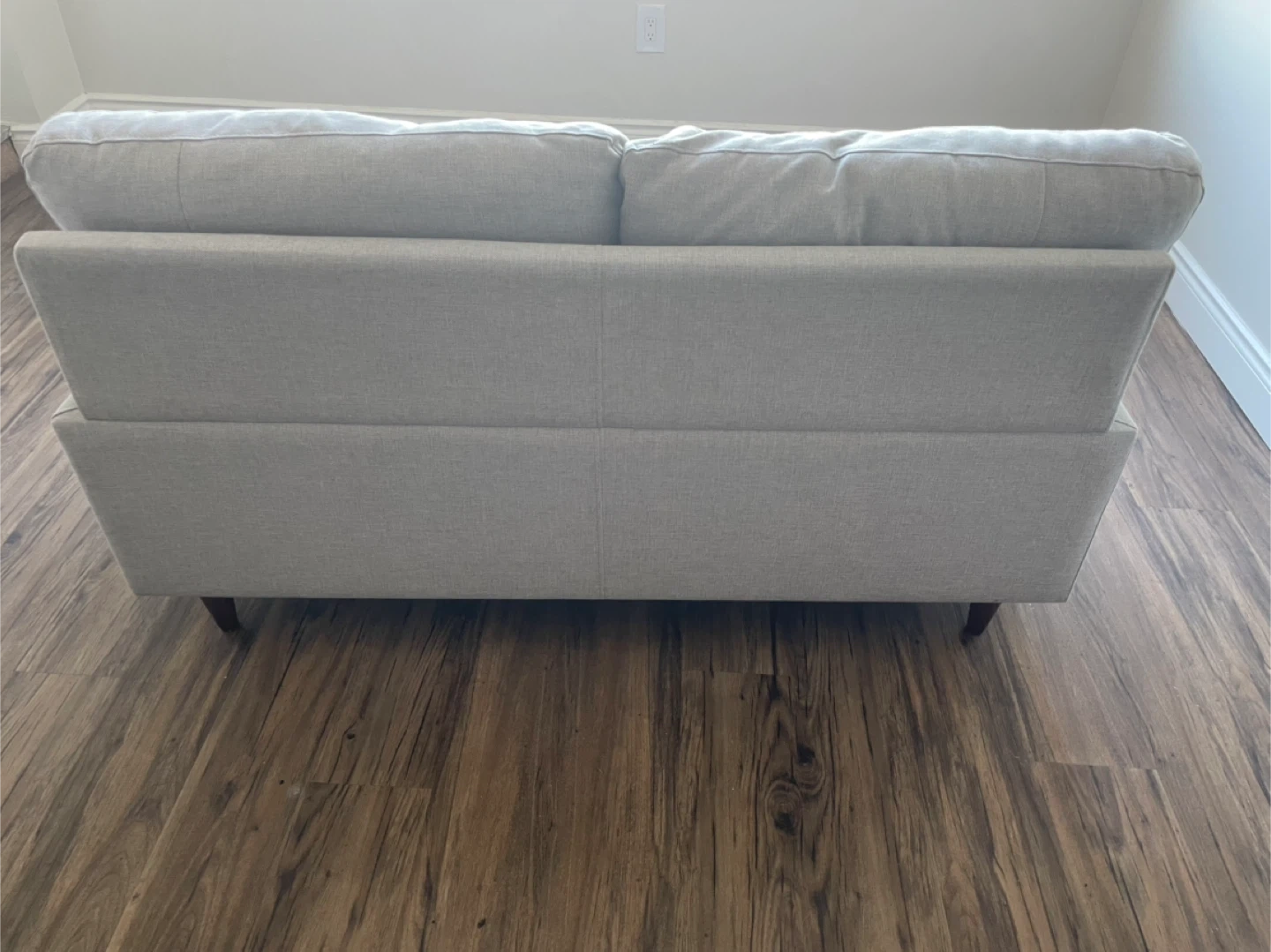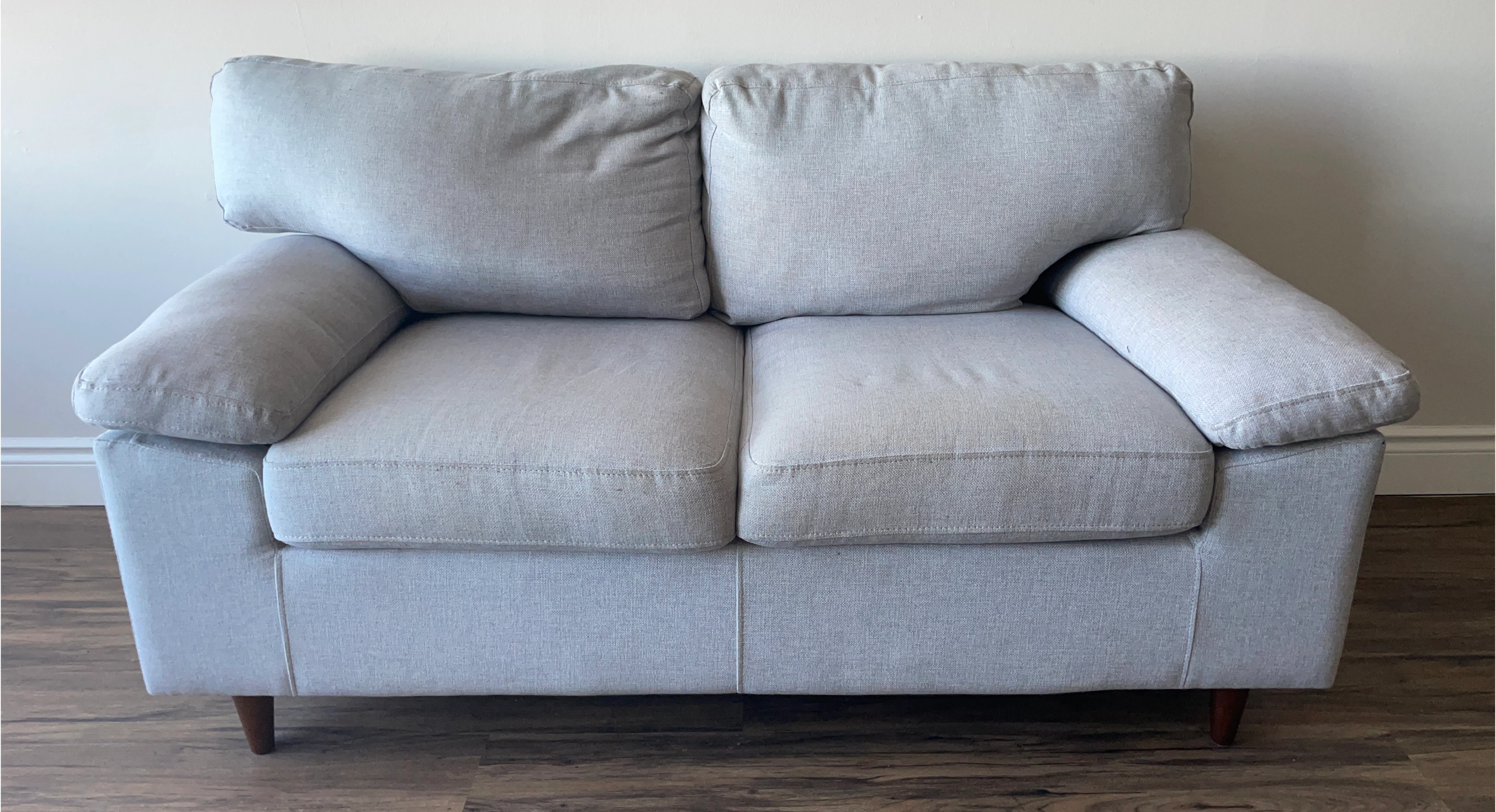 Selling a comfy loveseat sofa in a light grey colour. It's in great shape and would be perfect for a smaller space. The sofa features two cushions and wooden legs.