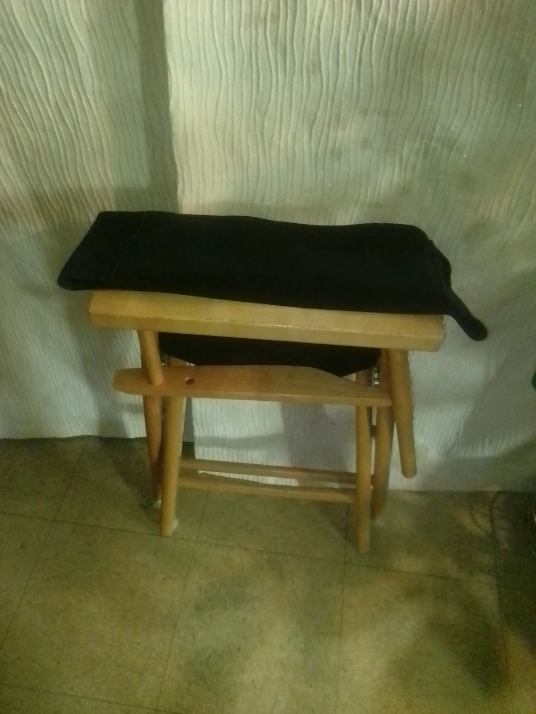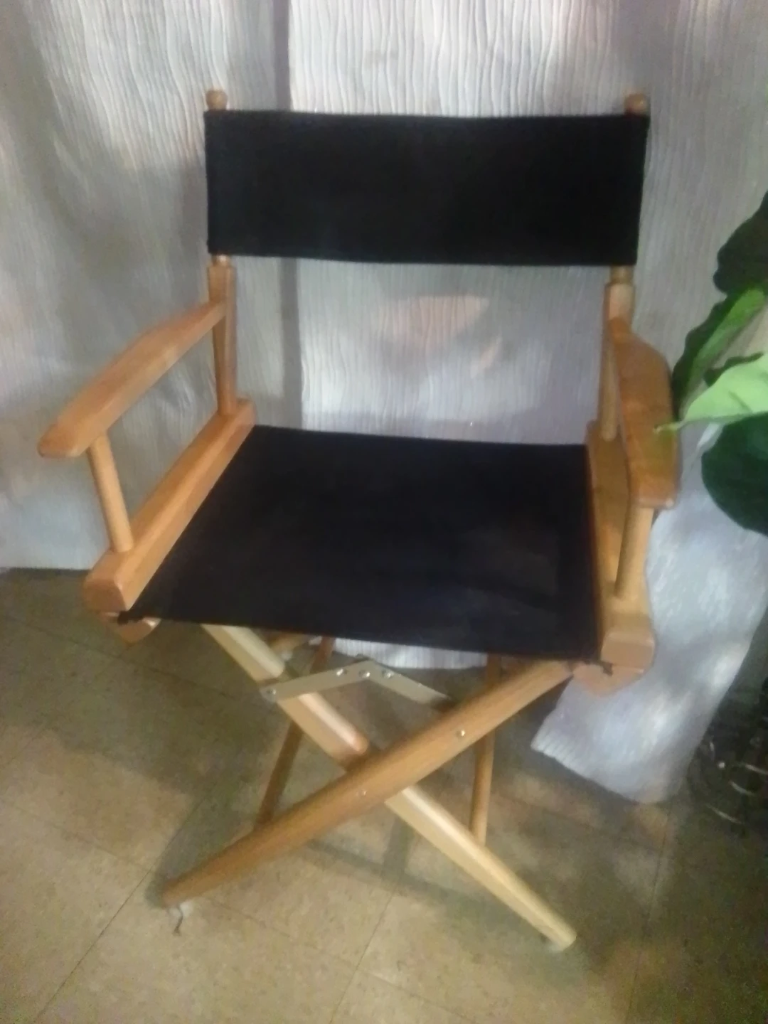 Selling a director's chair featuring a light wood frame and black canvas seat and back. It's in great shape and folds up easily for storage or transport. Perfect for events, workshops, or just adding a touch of Hollywood to your home!
