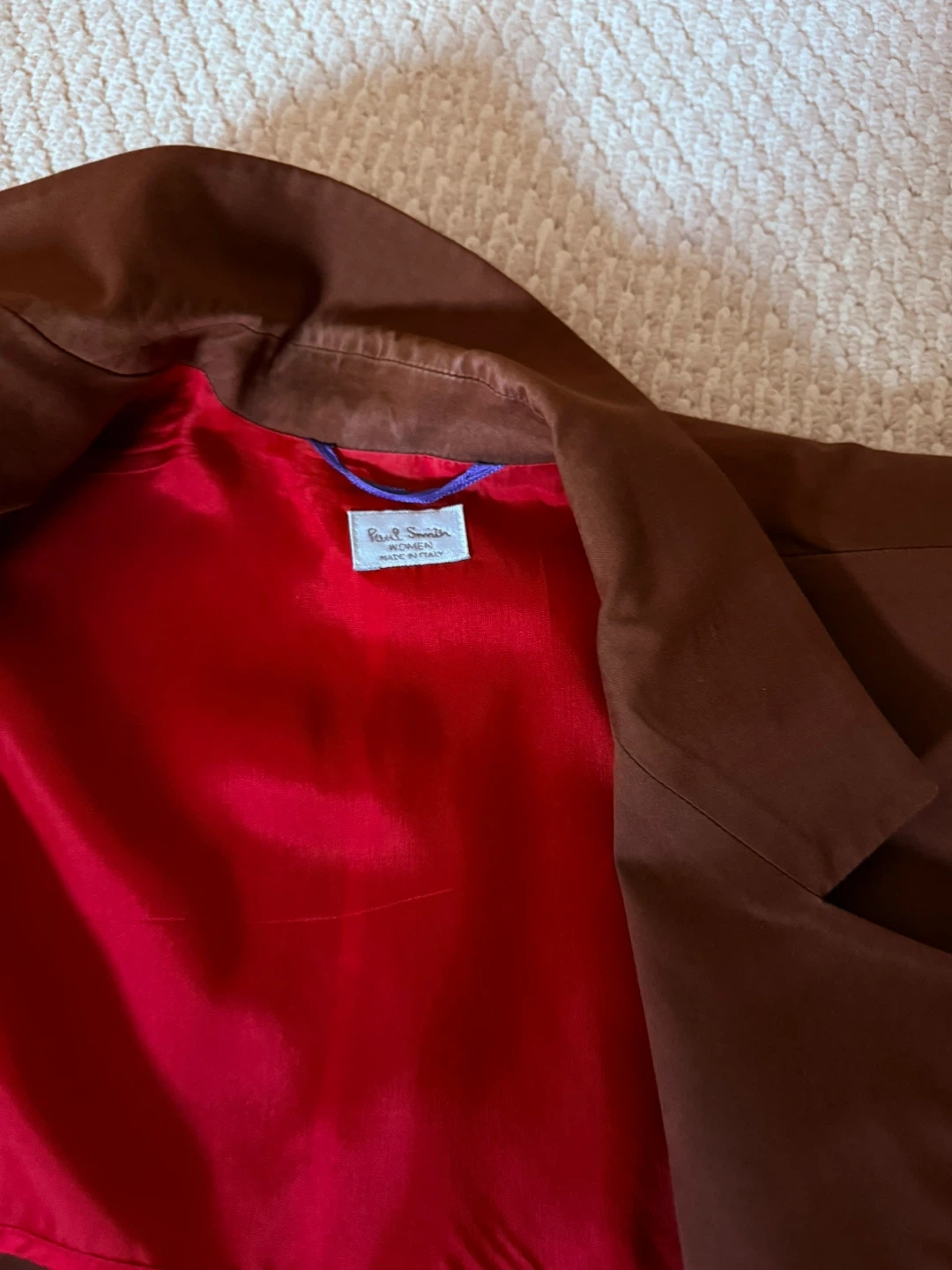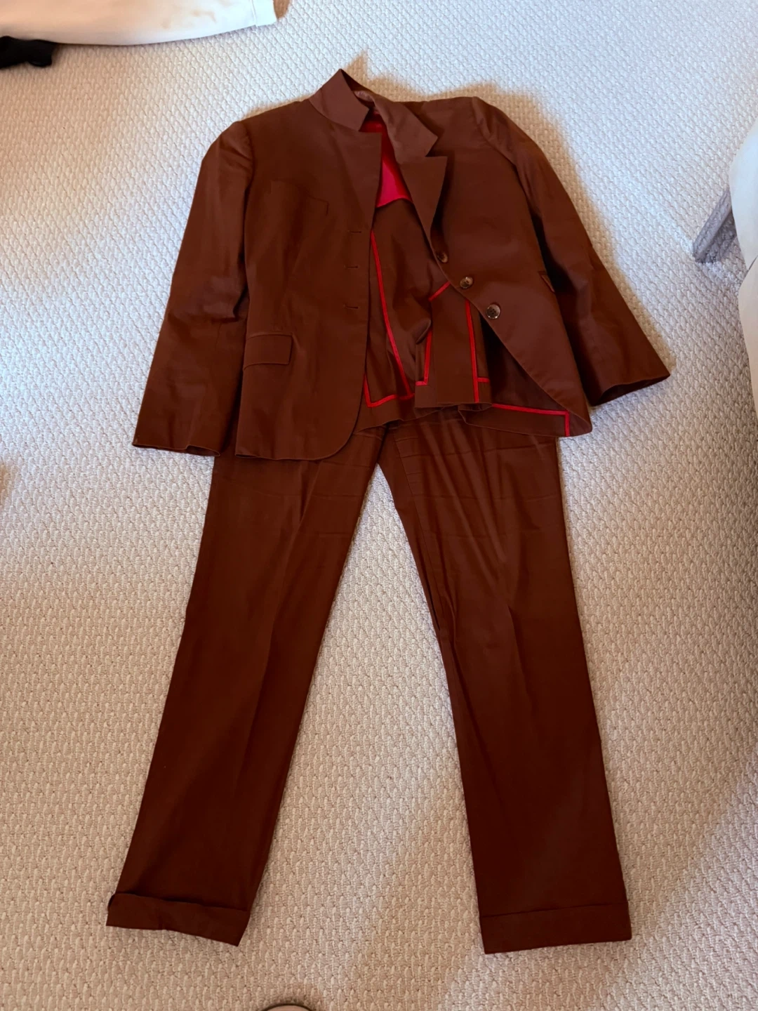 Selling a Paul Smith vintage women's pant suit in a beautiful brown colour! The suit is a size 42 and is made in Italy. It features a striking red lining that adds a pop of colour and style. It’s very light and comfortable to wear.