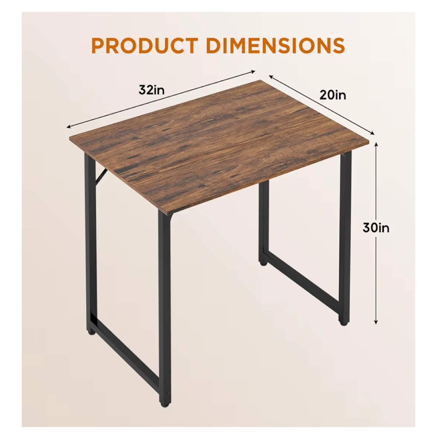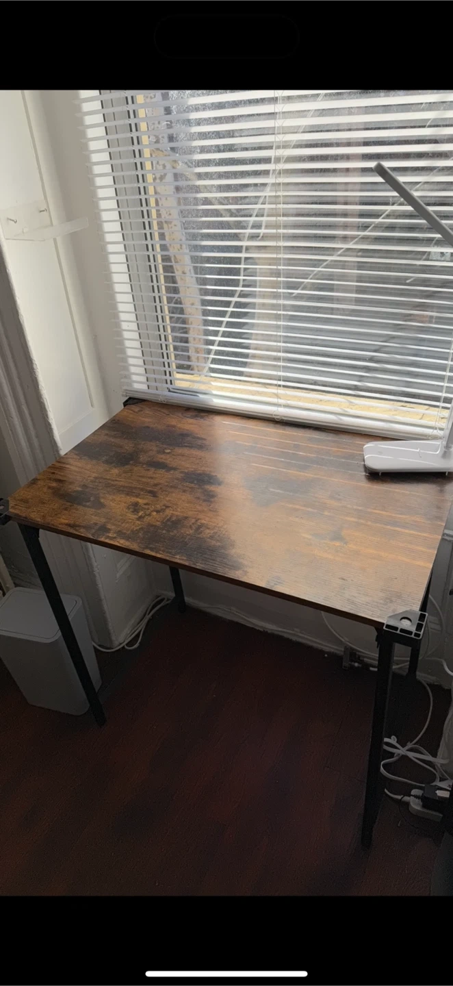 Selling a desk with a brown wood top and black metal legs. It's in great shape and measures 32 inches in length, 20 inches in width, and 30 inches in height. Perfect for a small office or workspace!