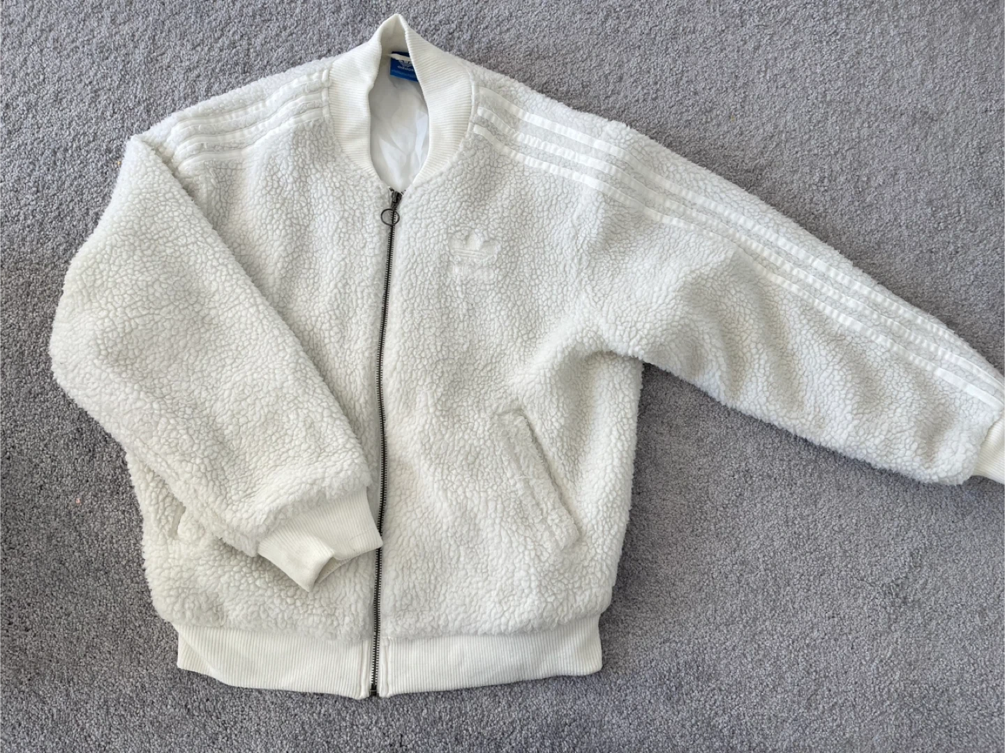 Selling a cozy Adidas sherpa jacket in a lovely white colour! It's a size 095, perfect for staying warm and stylish.
