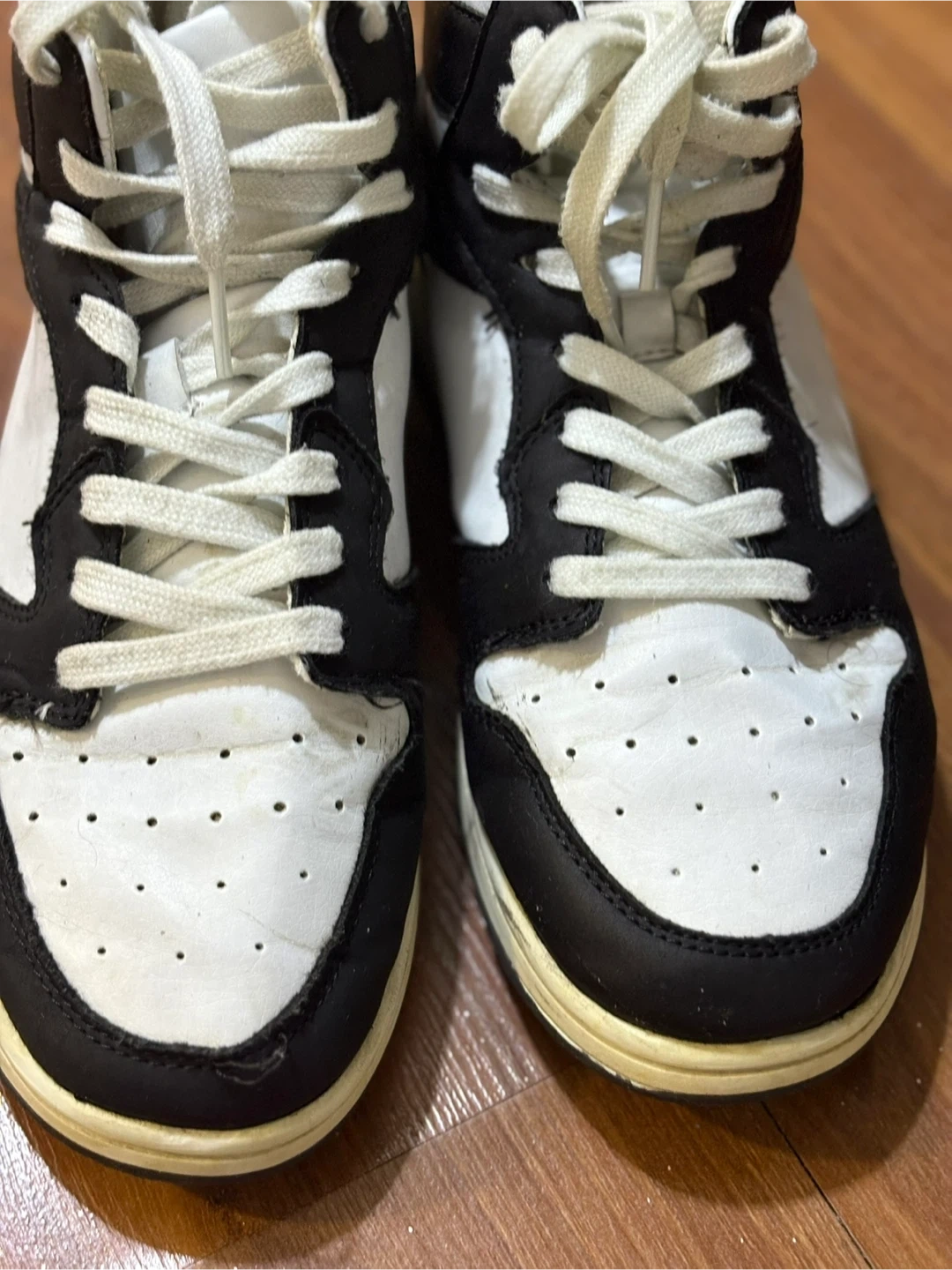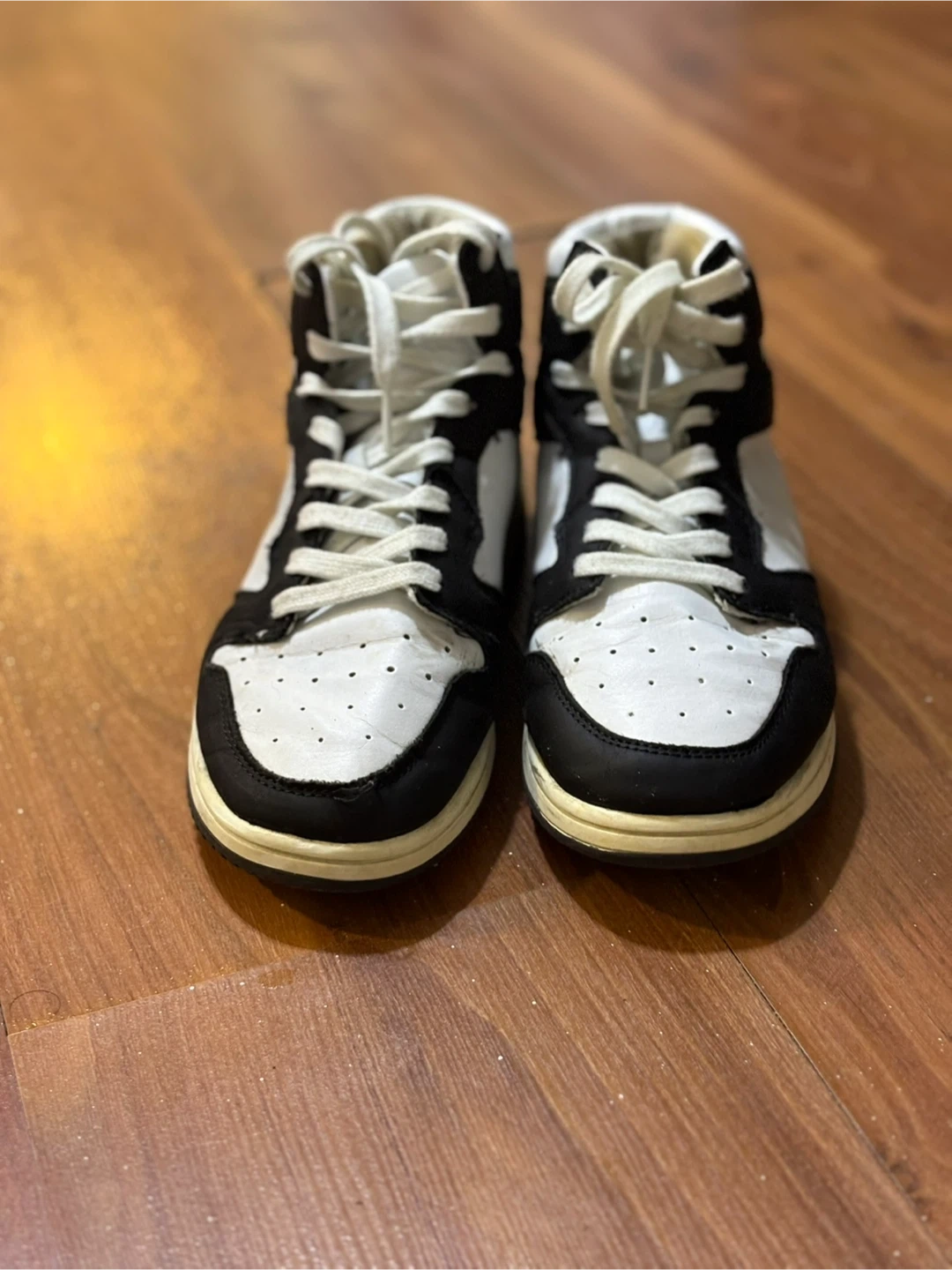 Selling a pair of Nike Dunk High Panda sneakers in size 10. They have a classic black and white colourway. Great for everyday wear!