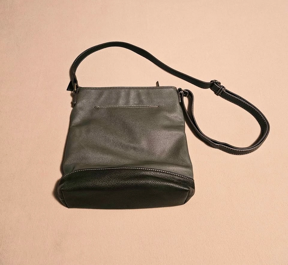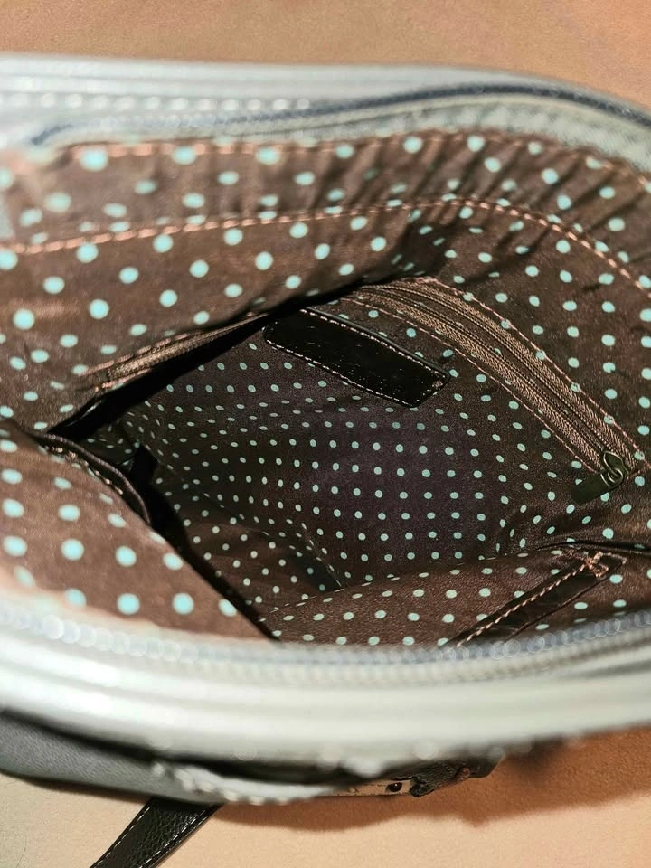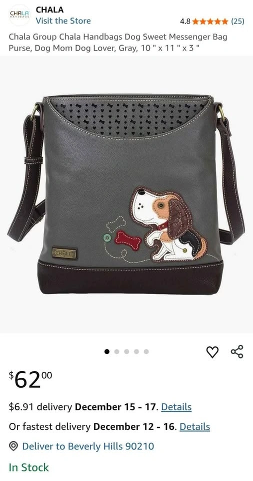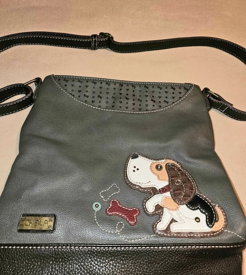 CHALA Sweet Messenger Mid Size (10"W x 11"H x 3"D) Purse. Shoulder Adjustable Strap 15"-30" Faux Vegan Leather Gray. Canvas Lining Super Cute Dog design. Excellent condition. $10 Retails at $62 US
