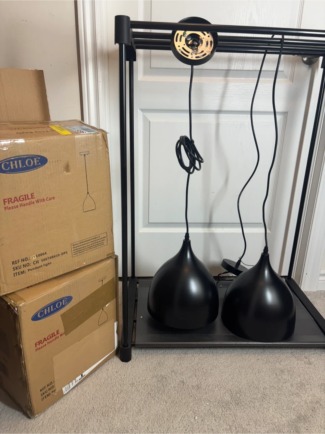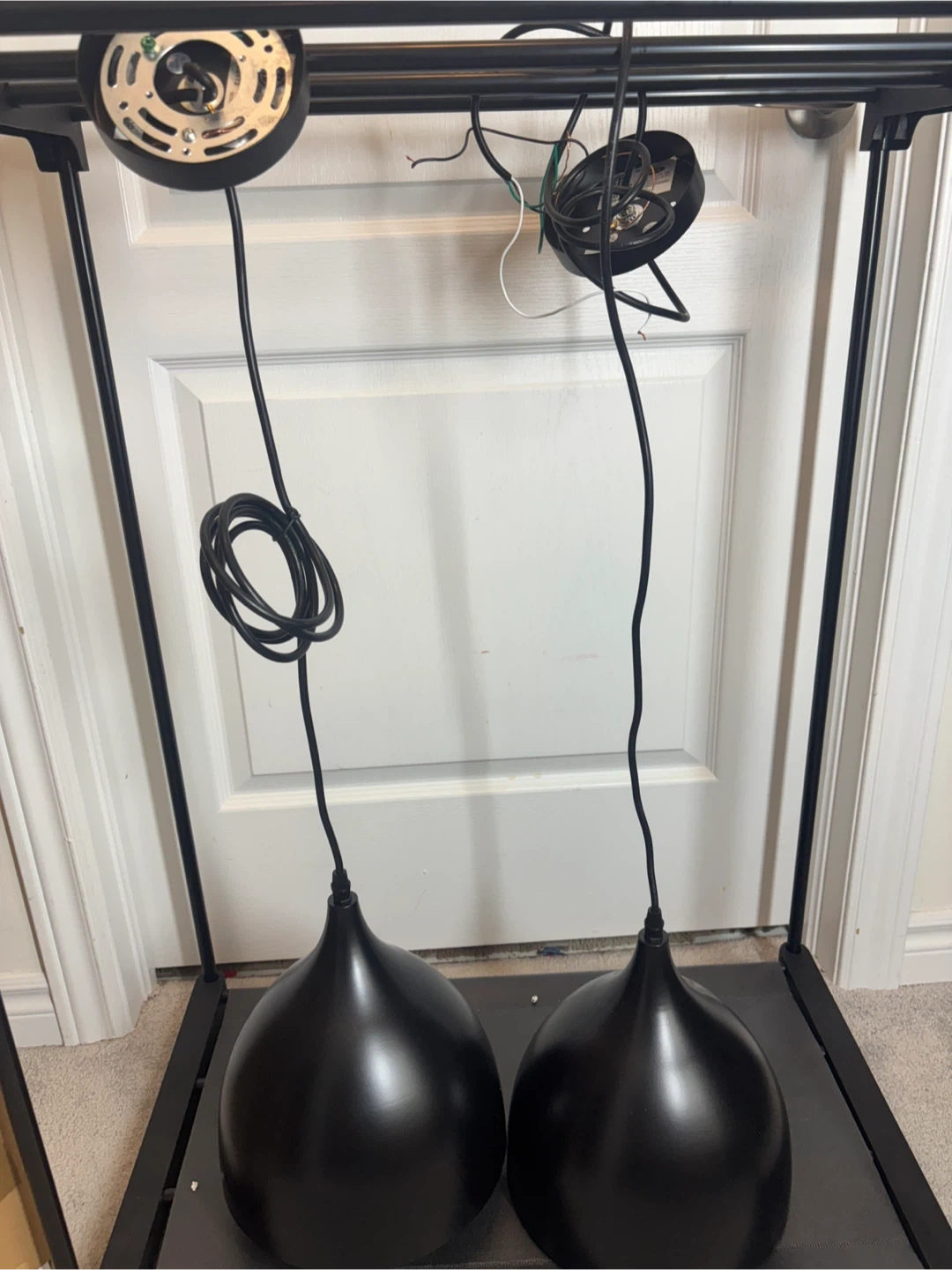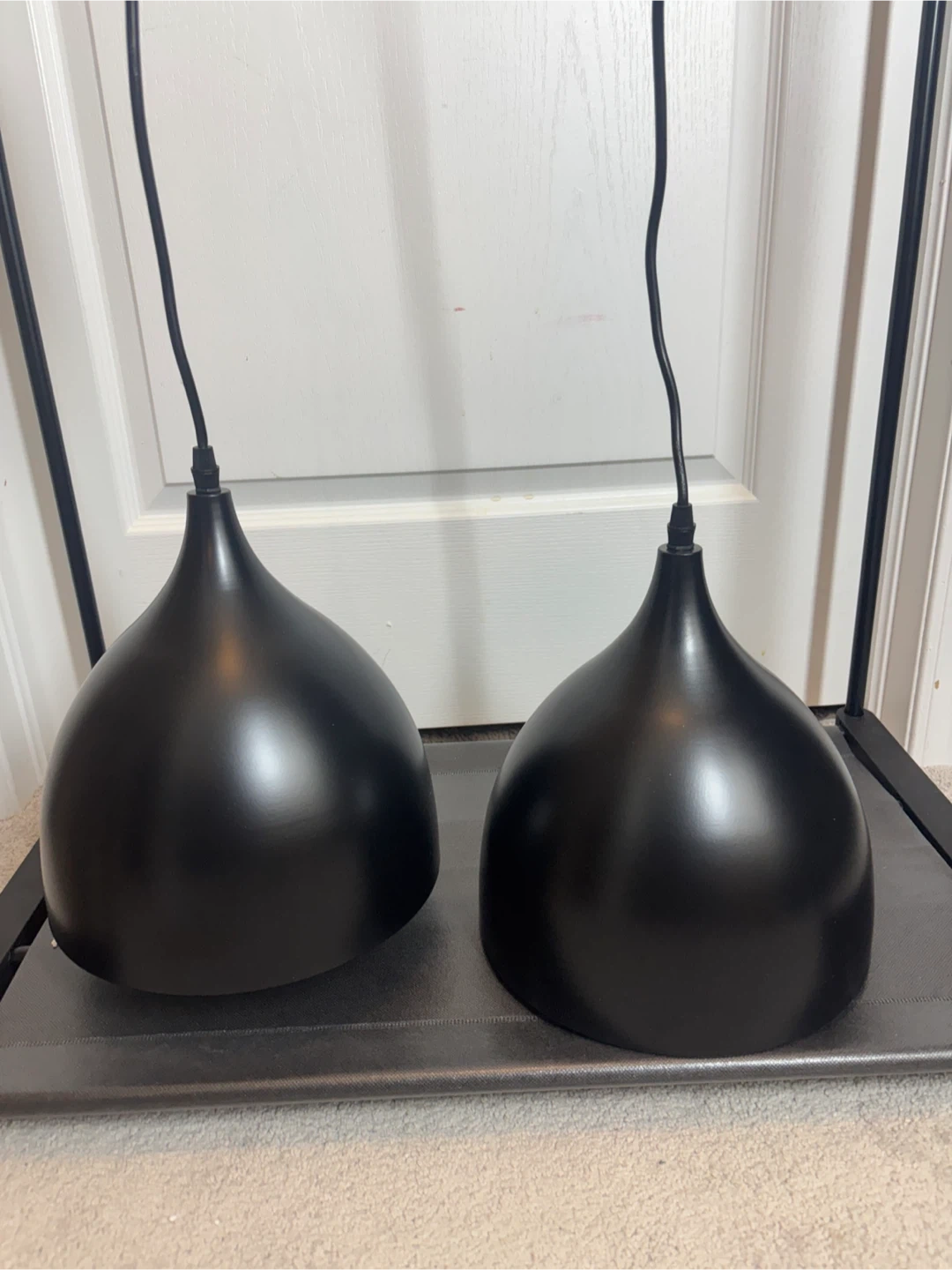 Selling a set of two pendant lights in black. The lights have a teardrop shape and would look great in any room.