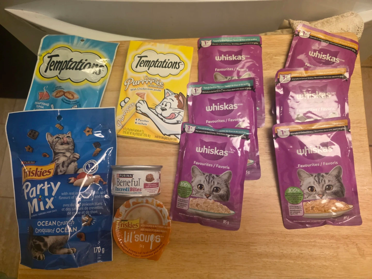 Selling a variety pack of cat food and treats! Includes Whiskas Favourites, Temptations, Purina Party Mix, Beneful IncrediBites, and Friskies Lil' Soups. Perfect for spoiling your furry friend with different flavours and textures!