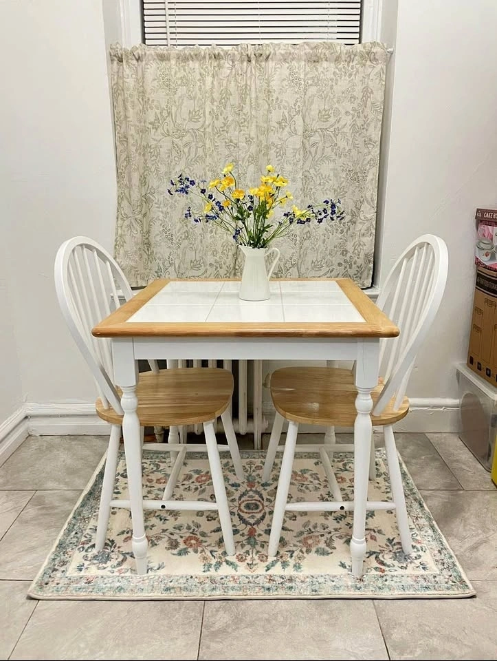 Sturdy white wood dining table set with 2 chairs. Can sit up to 4 people. Table has a white tile top with a wooden border, dimensions: 29.5" H x 29.5" W x 29.5" D, weighs 44lb. Chairs have wooden seats with white legs and frames. Great condition.
