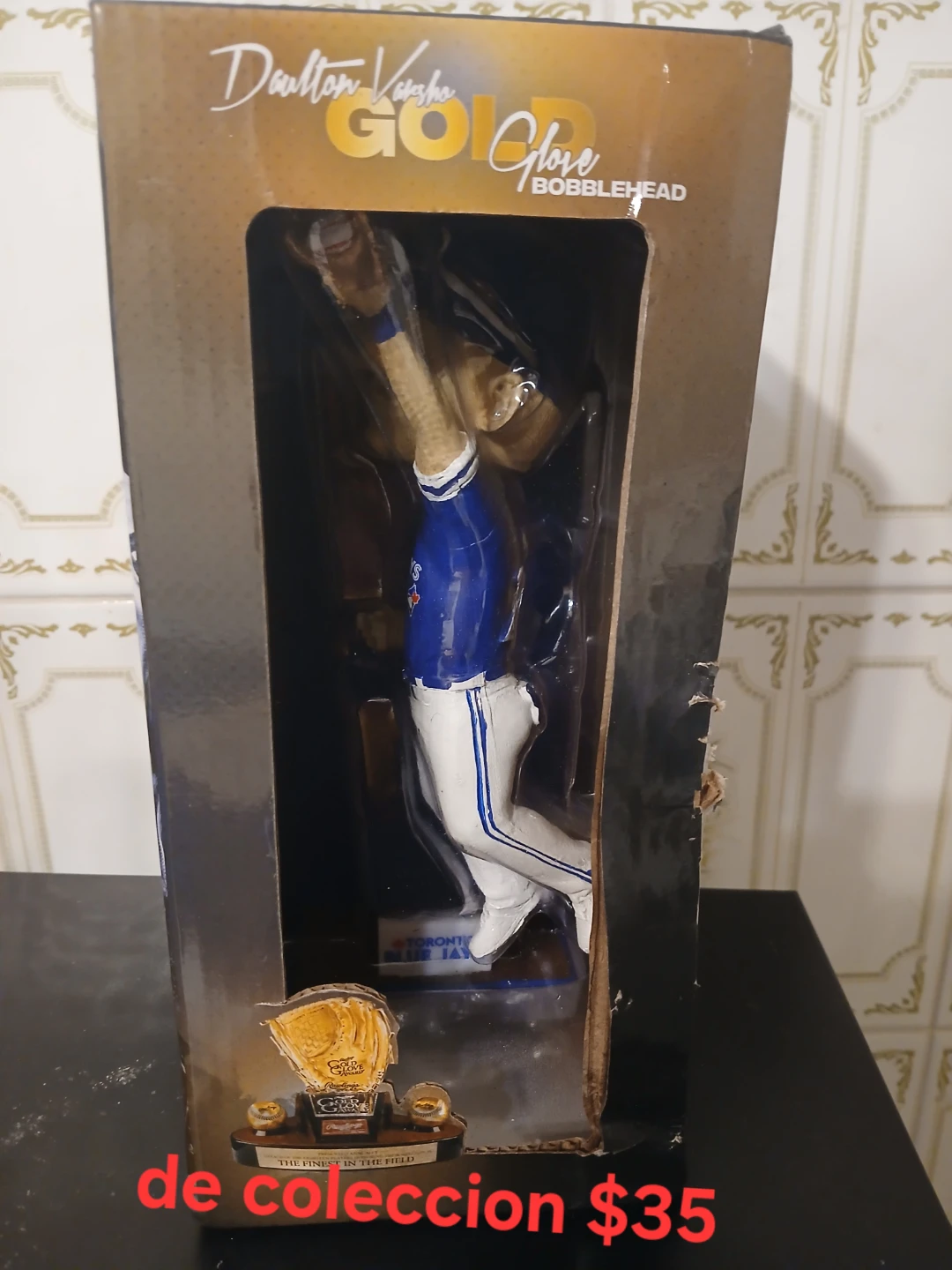 Selling a Daulton Varsho Gold Glove Bobblehead! It comes in its original box. The box says "The Finest in the Field". the box is a little damaged