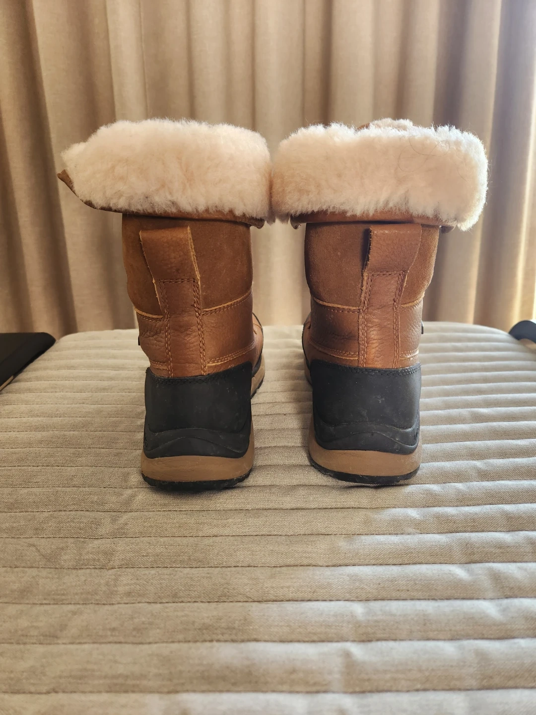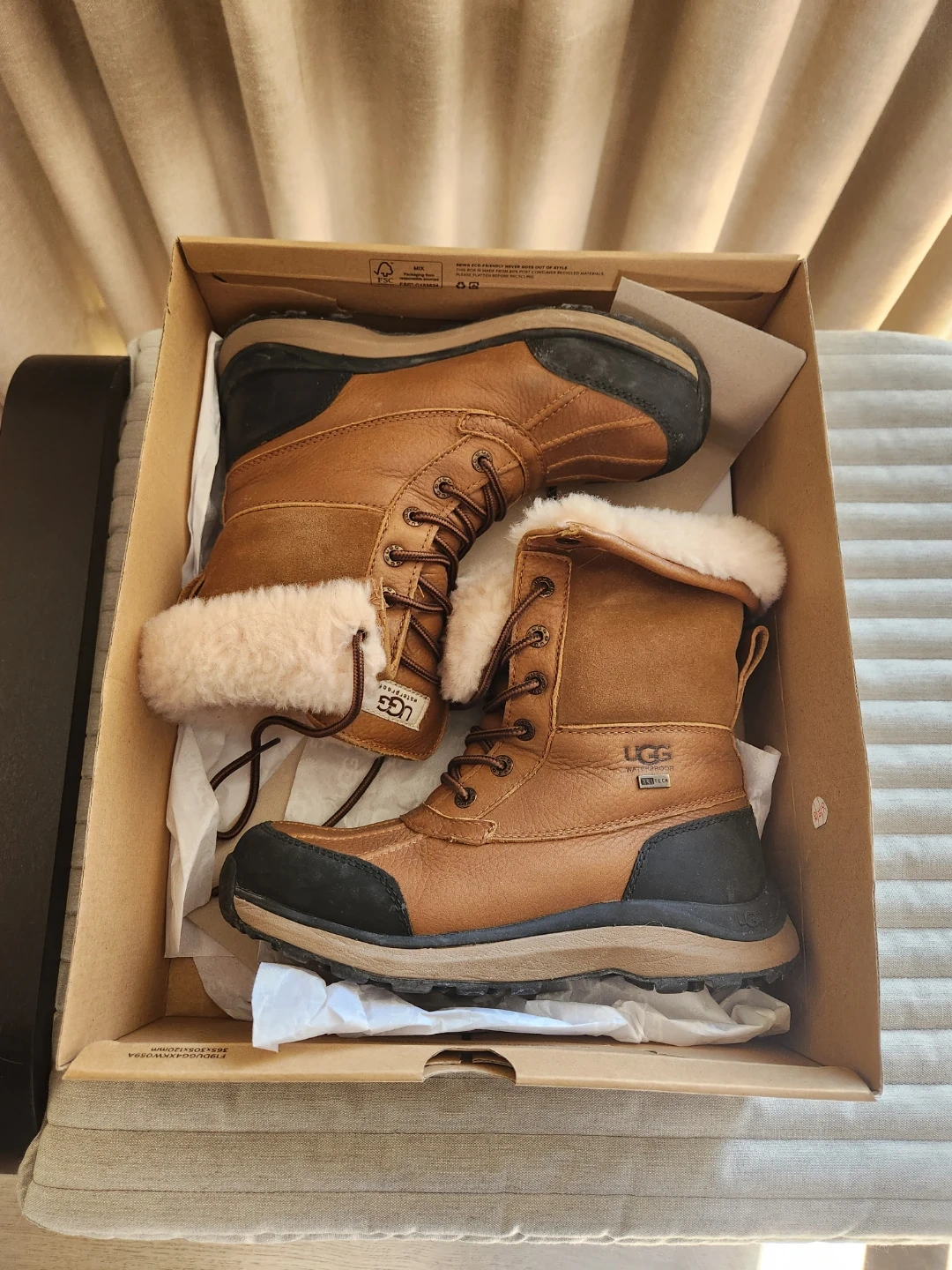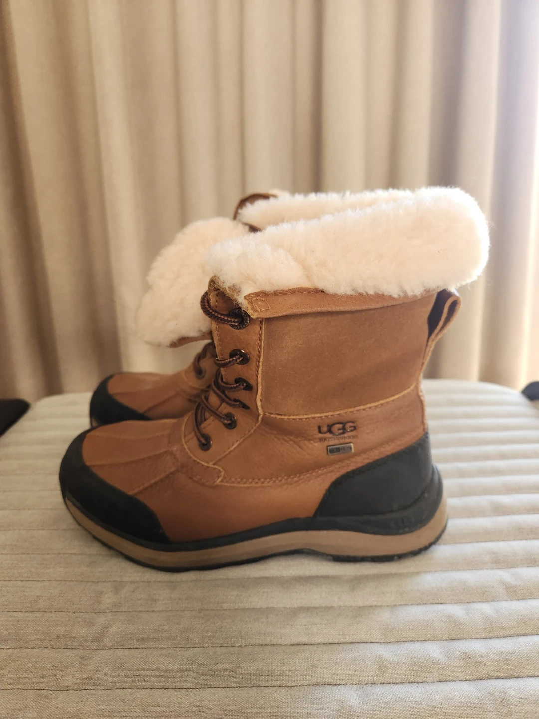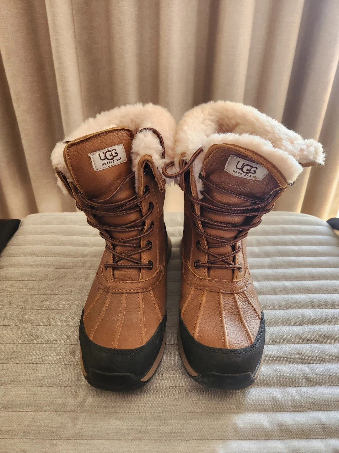 Selling a pair of UGG waterproof leather boots in size 7 ladies. They come with the original box. These boots are perfect for keeping your feet warm and dry during the colder months!