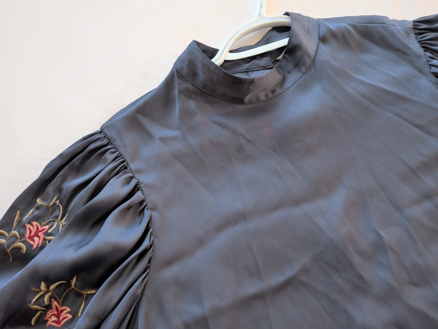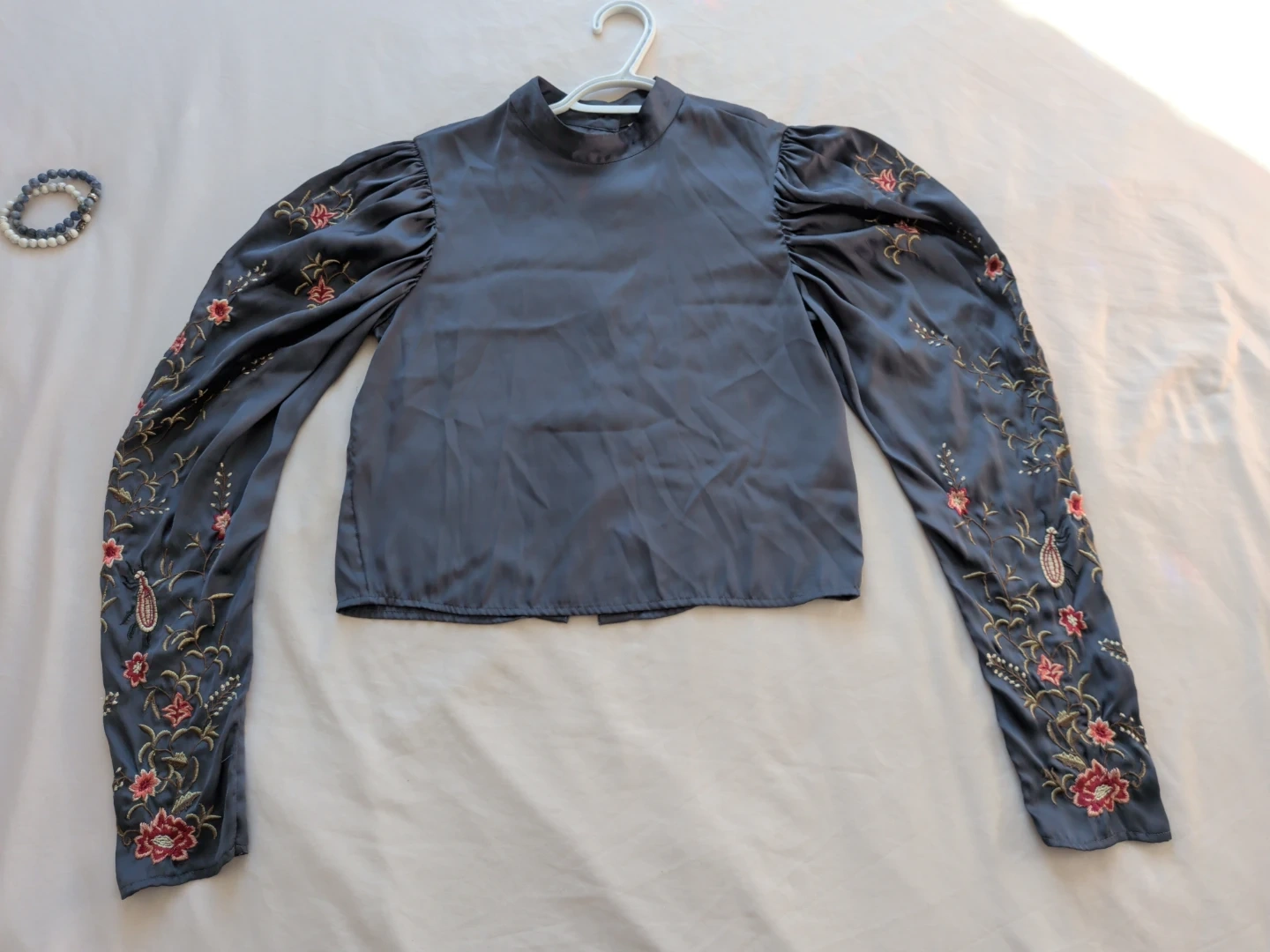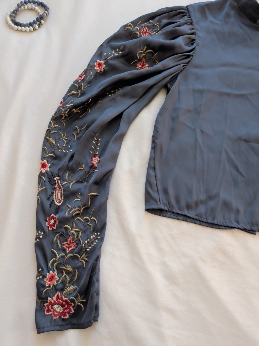 Here's a lovely grey blouse with floral embroidery on the sleeves! It has a high neckline and a unique design. Perfect for adding a touch of elegance to your wardrobe