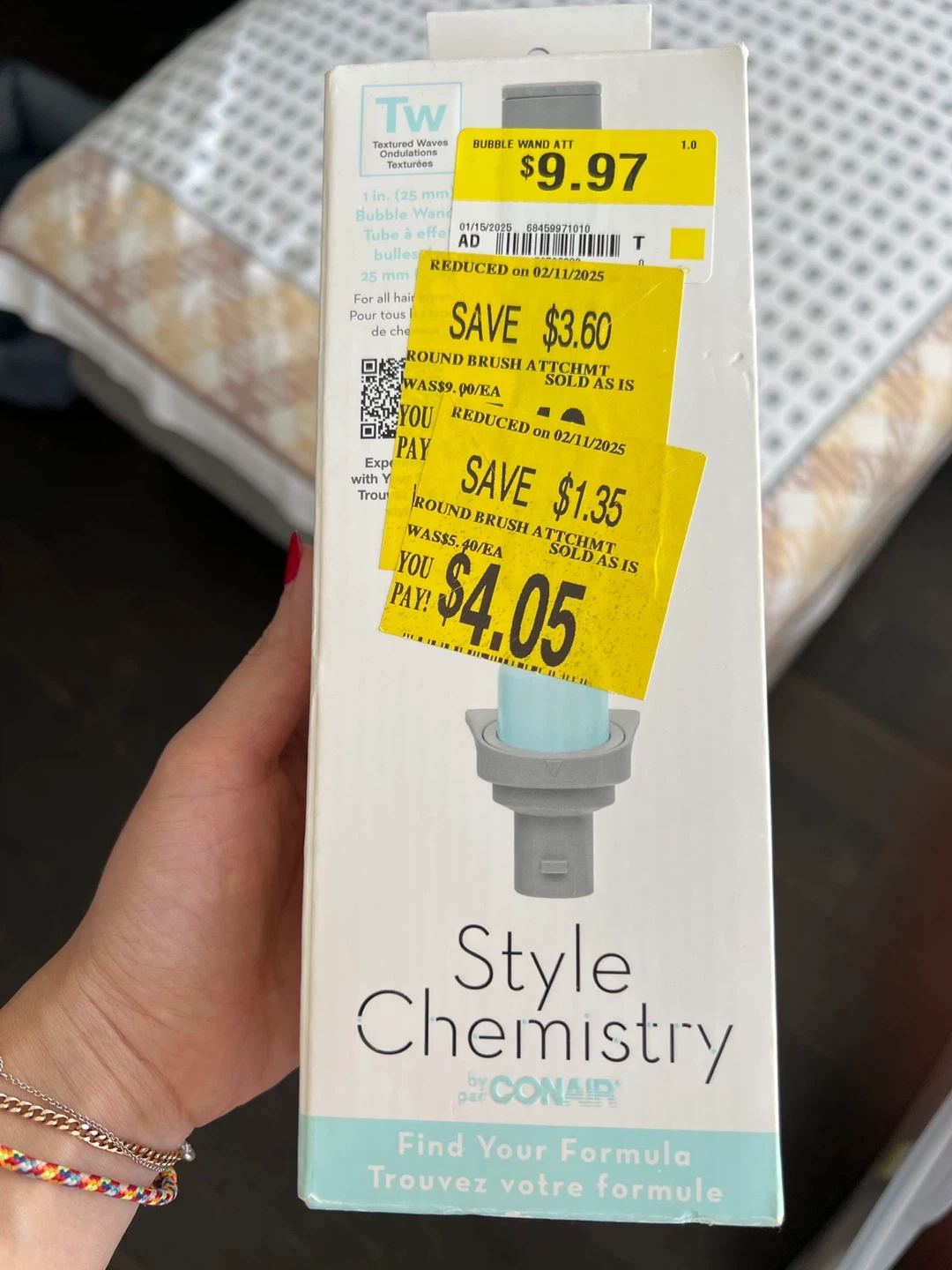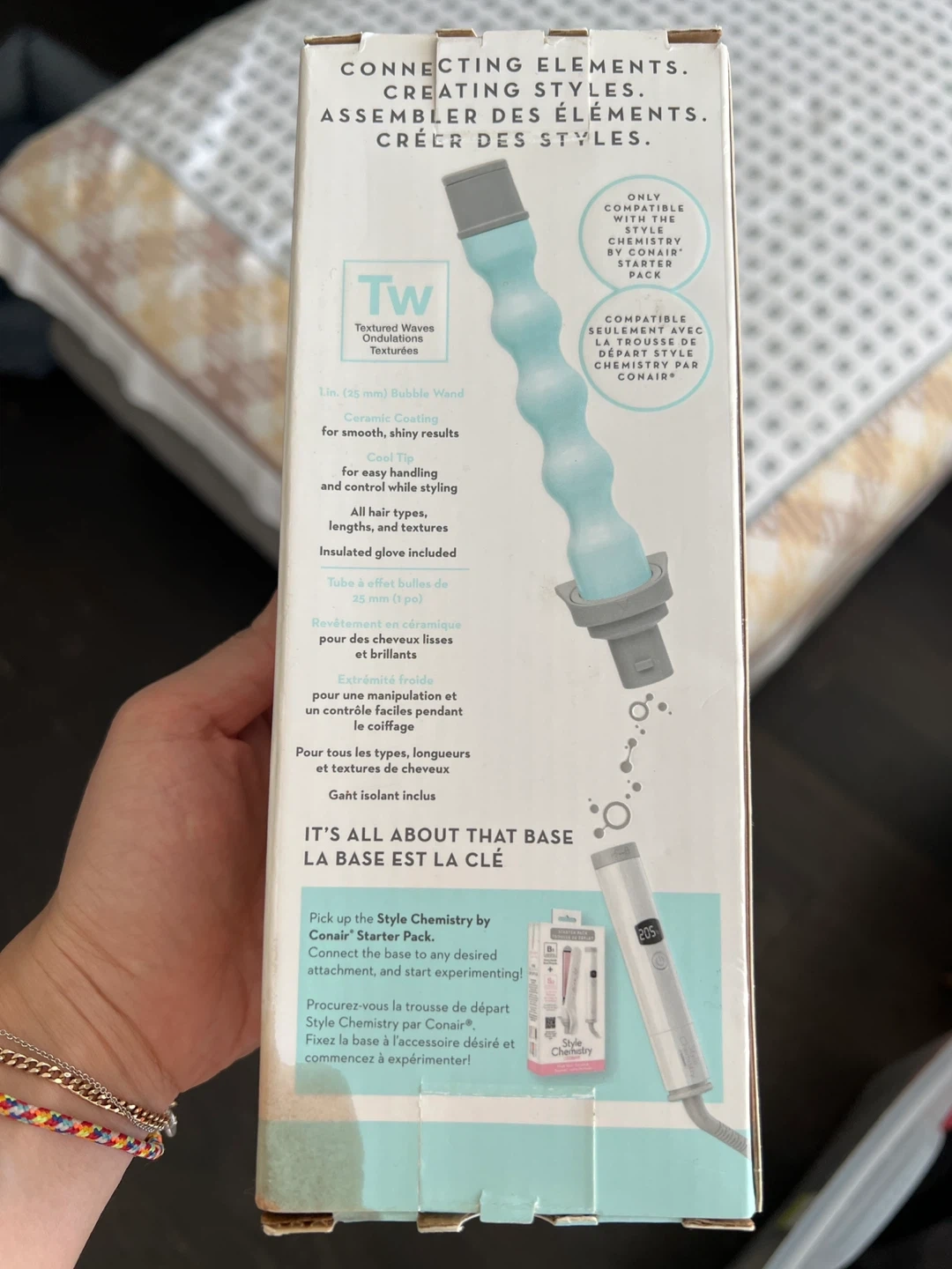 Selling a Conair Style Chemistry bubble wand attachment. It's a textured waves bubble wand, 1 in (25 mm). It's ceramic coated for smooth, shiny results. Suitable for all hair types, lengths, and textures. An insulated glove is included