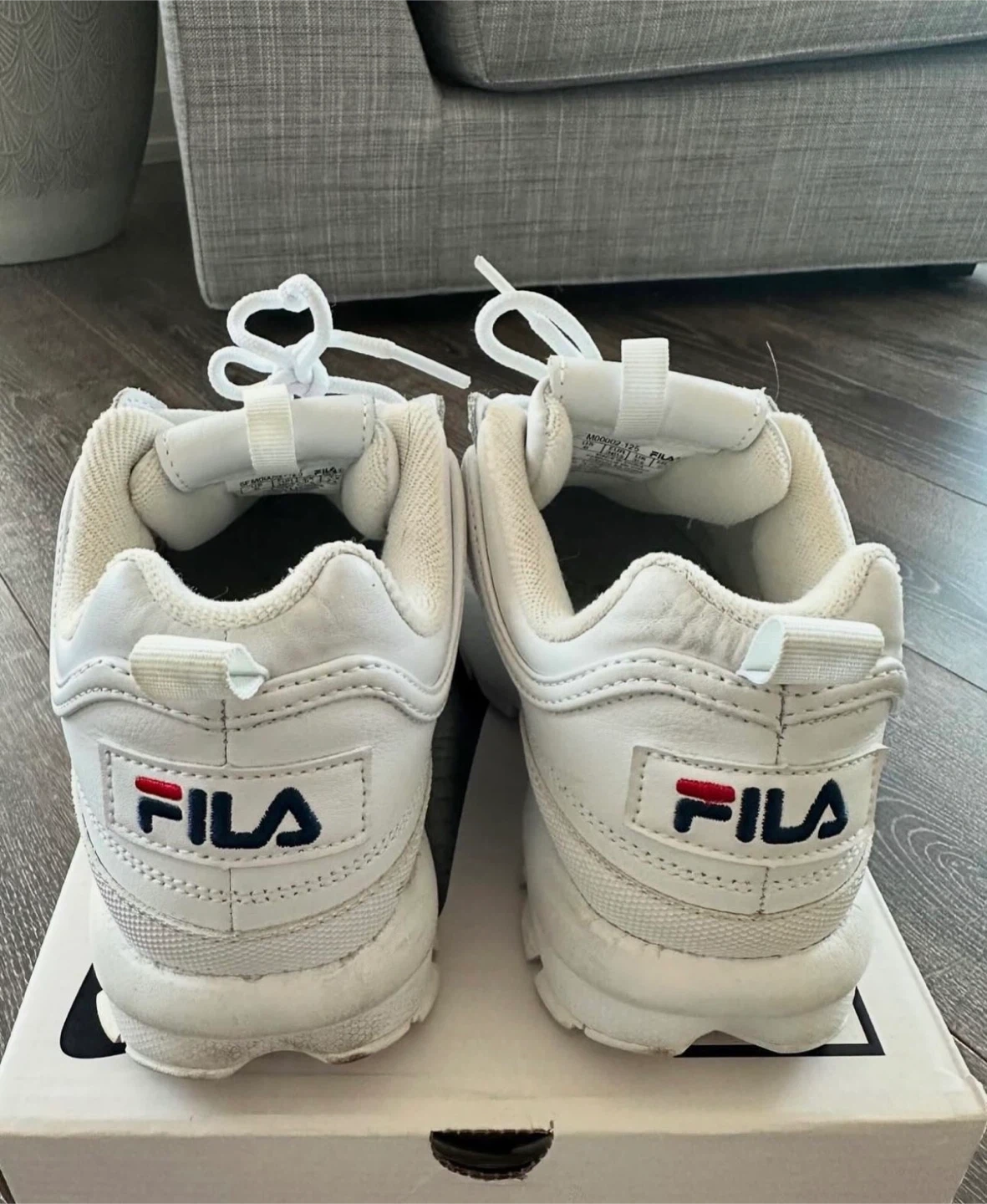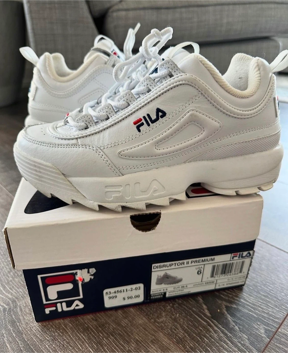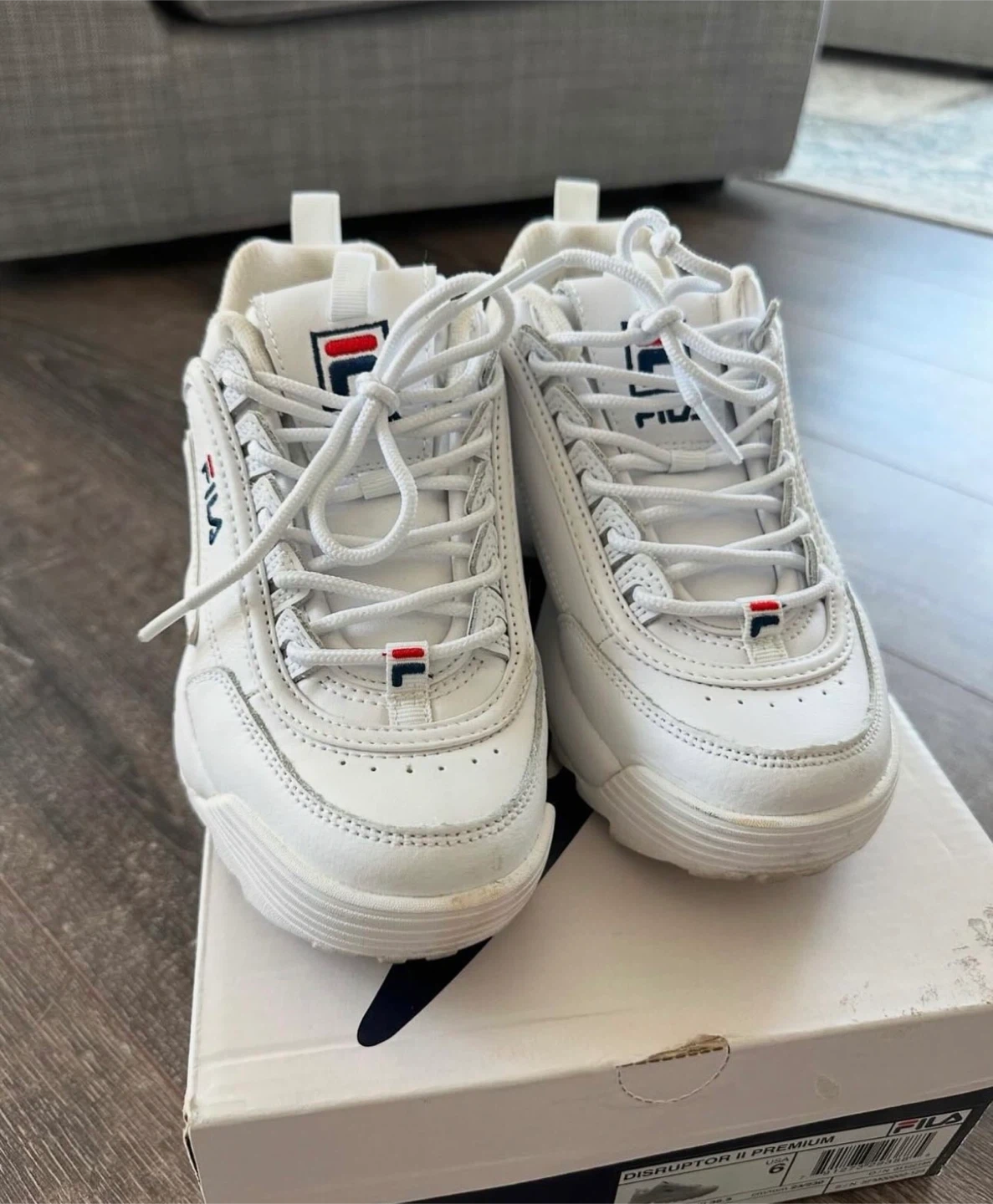 Selling a pair of Fila Disruptor II Premium sneakers in white, size 6. They come with the original box. These shoes are in good condition and ready for a new owner!