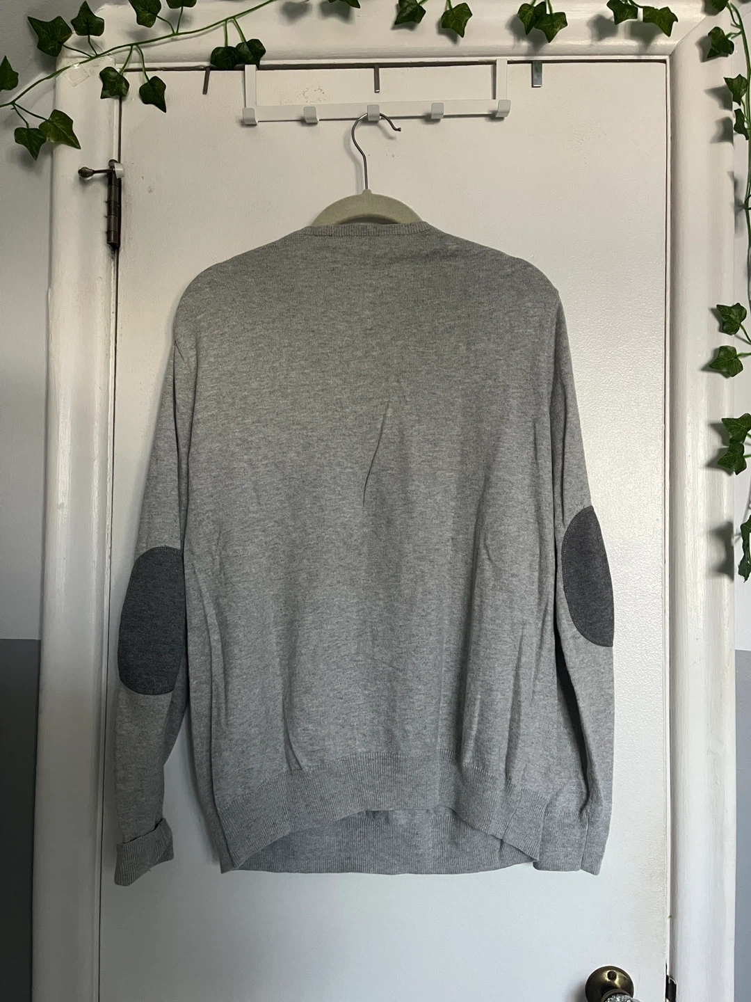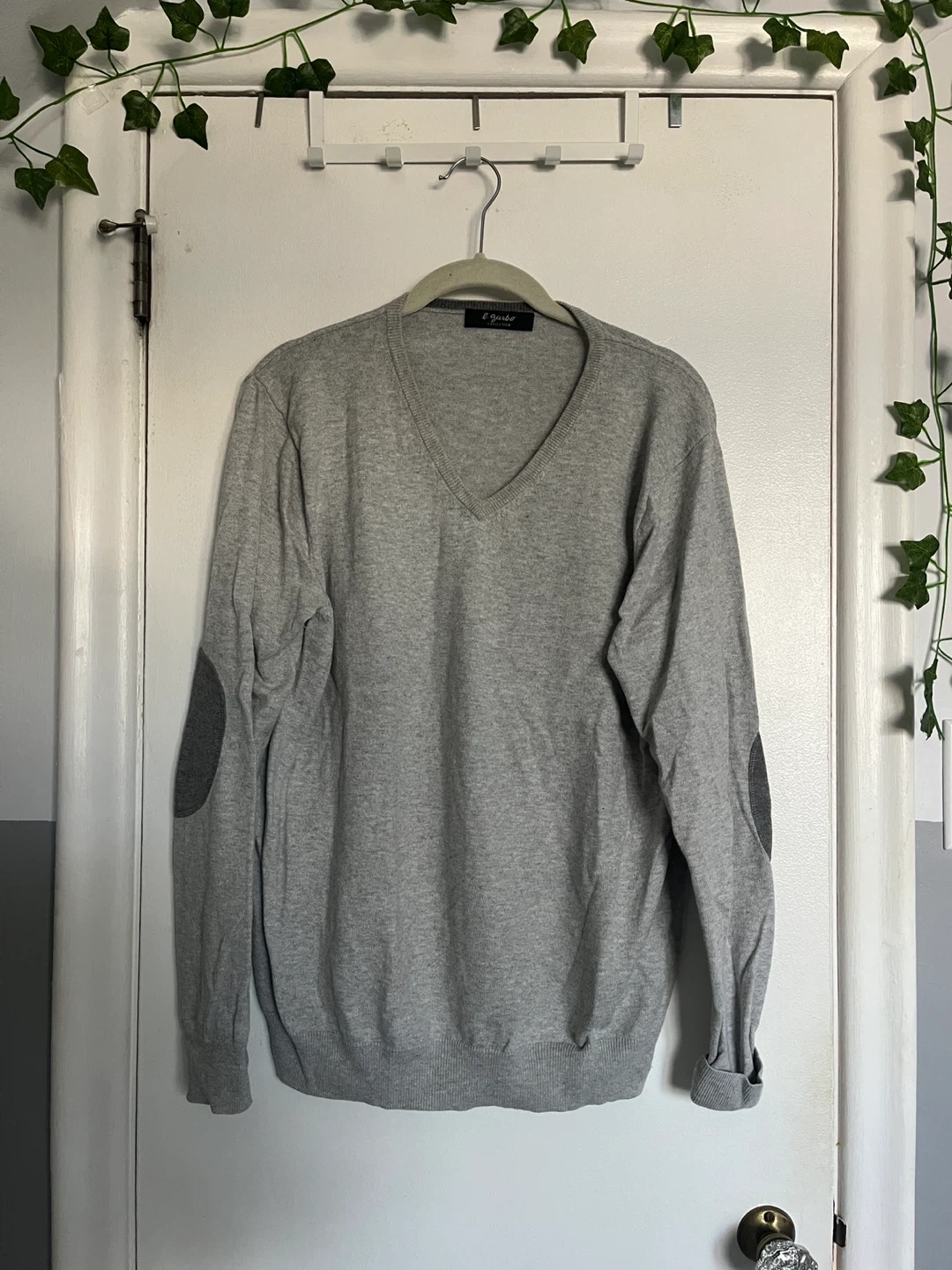 Selling a gently used E Garbo Collection sweater in a lovely grey colour! It's a size medium and made from a soft blend of cotton and cashmere. It has a classic V-neck design and elbow patches for a touch of style. Perfect for layering or wearing on its own!