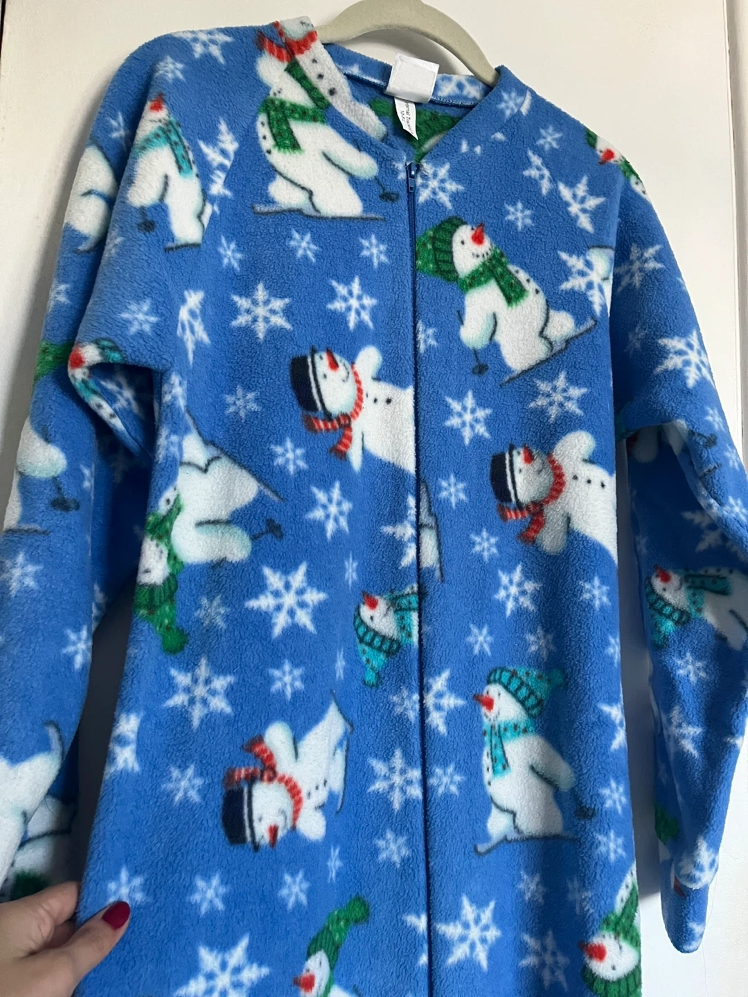 Snug As A Bug onesie in adult size small! It's blue with a cute snowman and snowflake pattern. Perfect for cozy nights in or a fun winter pj outfit!