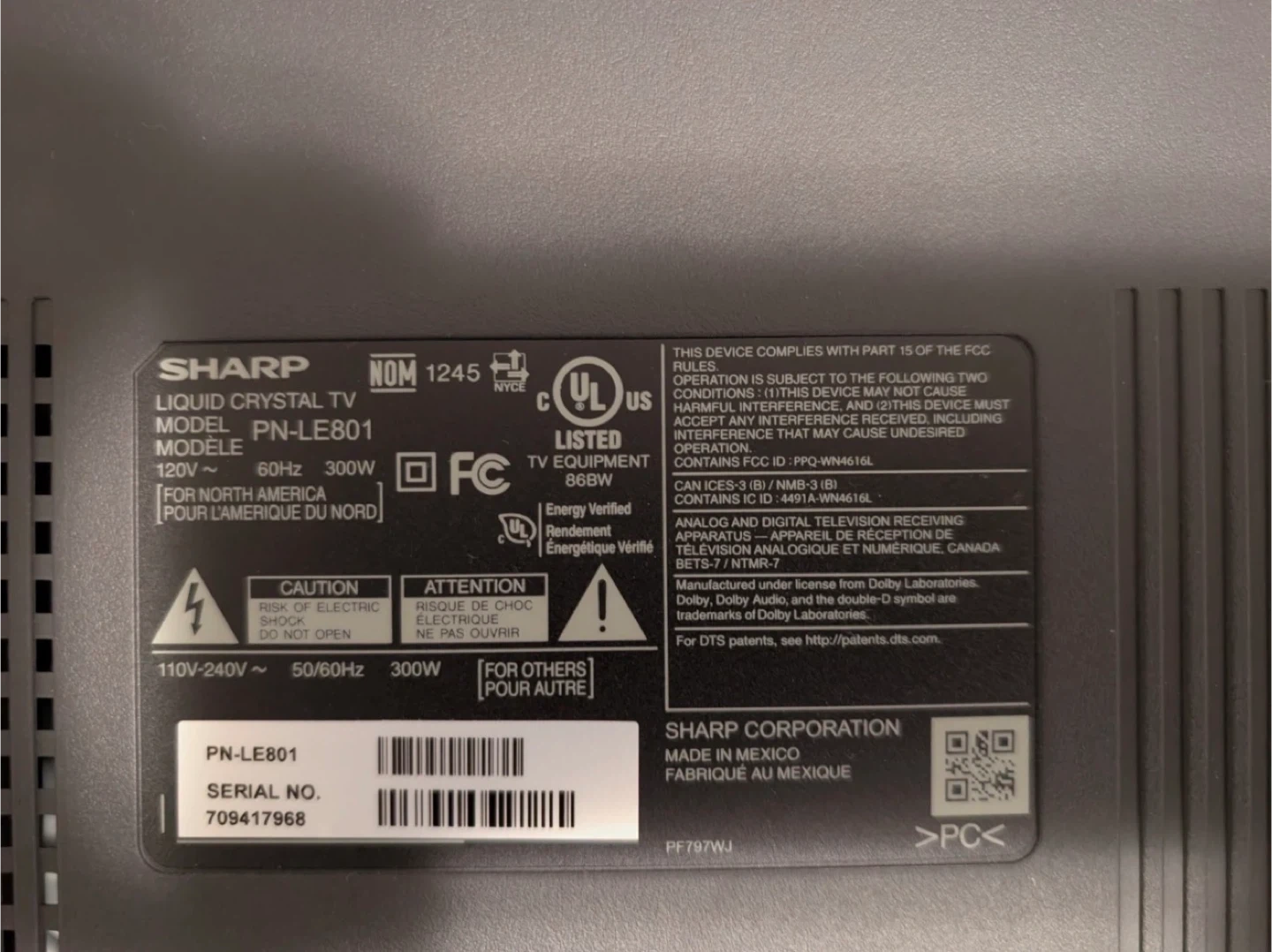 Selling a Sharp Liquid Crystal TV, model PN-LE801. It operates at 110V-240V ~ 50/60Hz 300W.