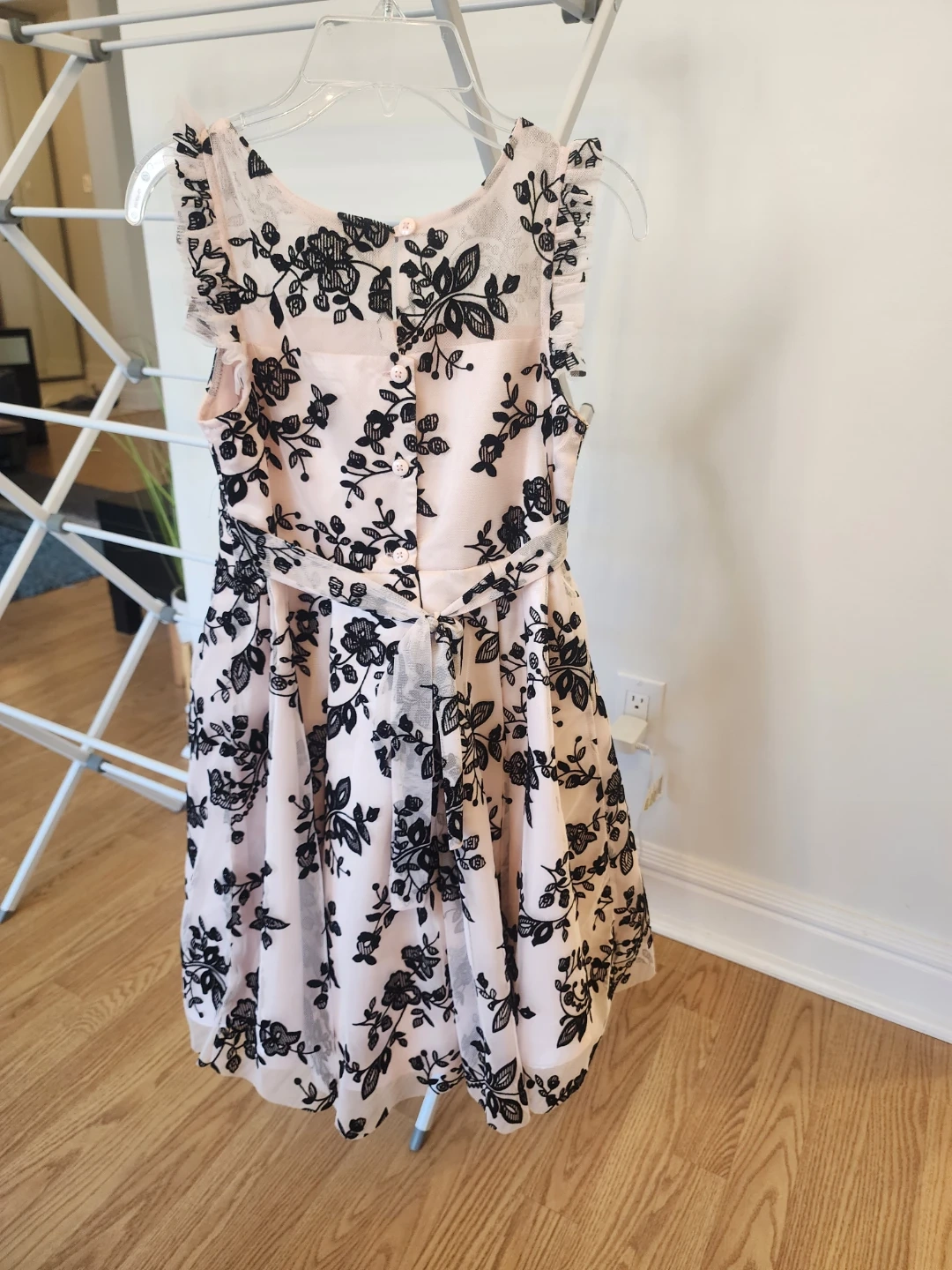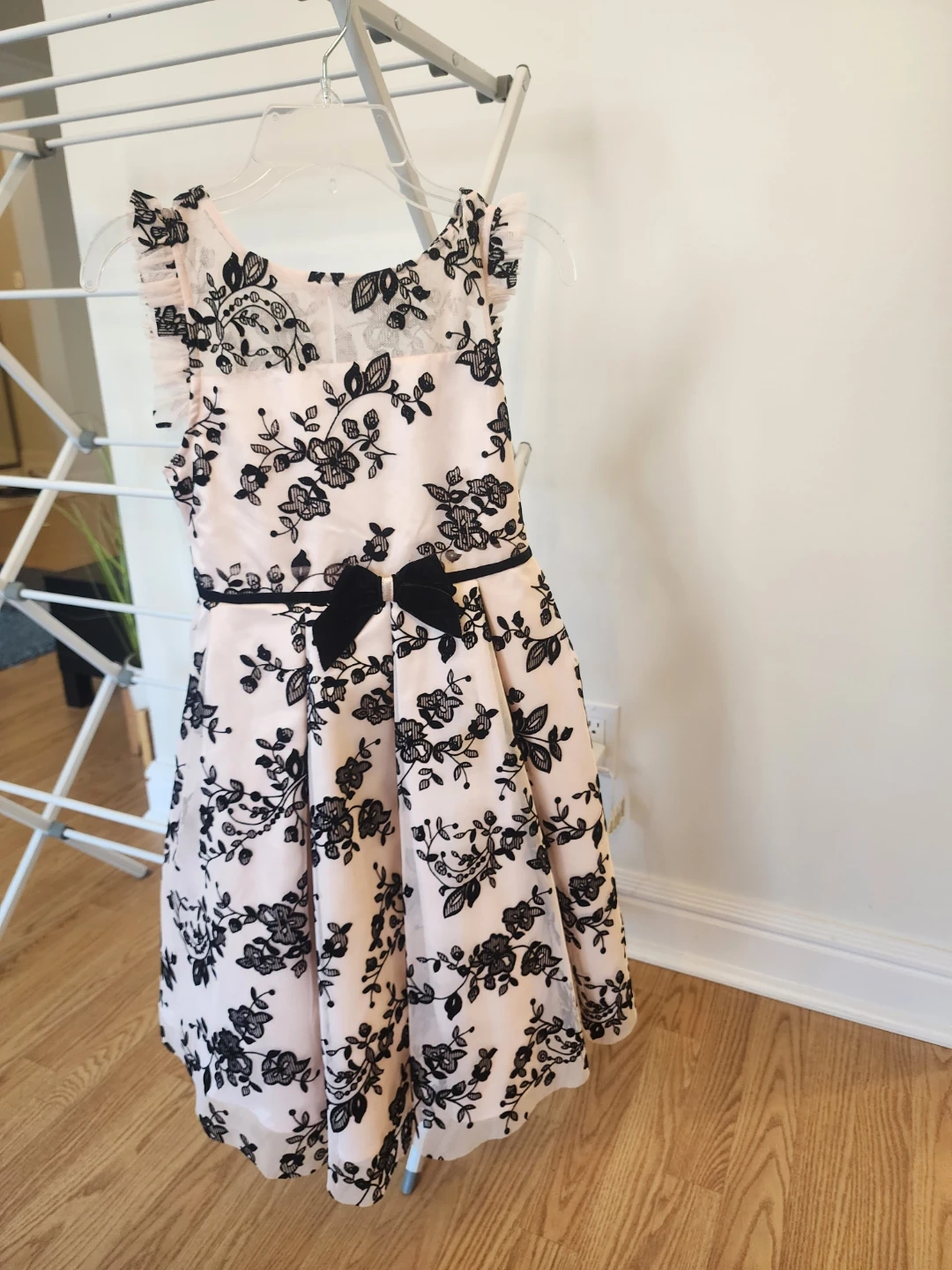 This adorable girls' dress features a lovely pink fabric with a black floral print. It's in great condition and ready for a new adventure! Perfect for parties or special occasions.