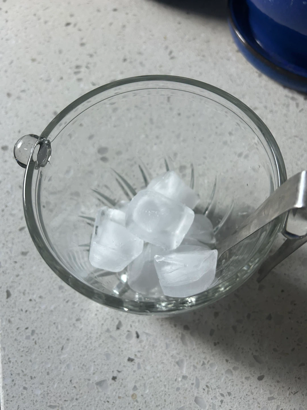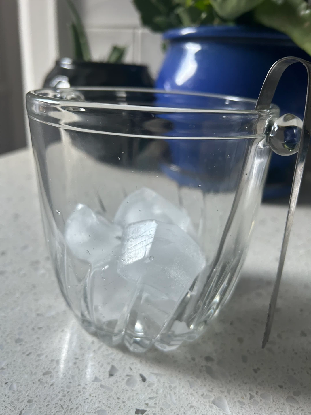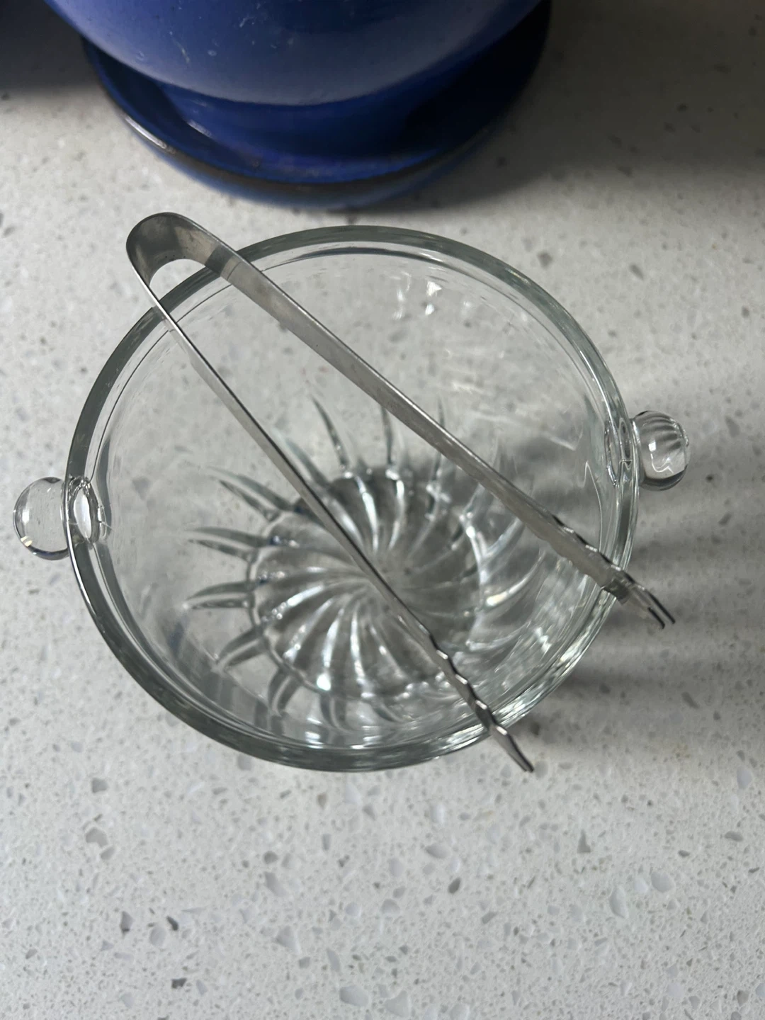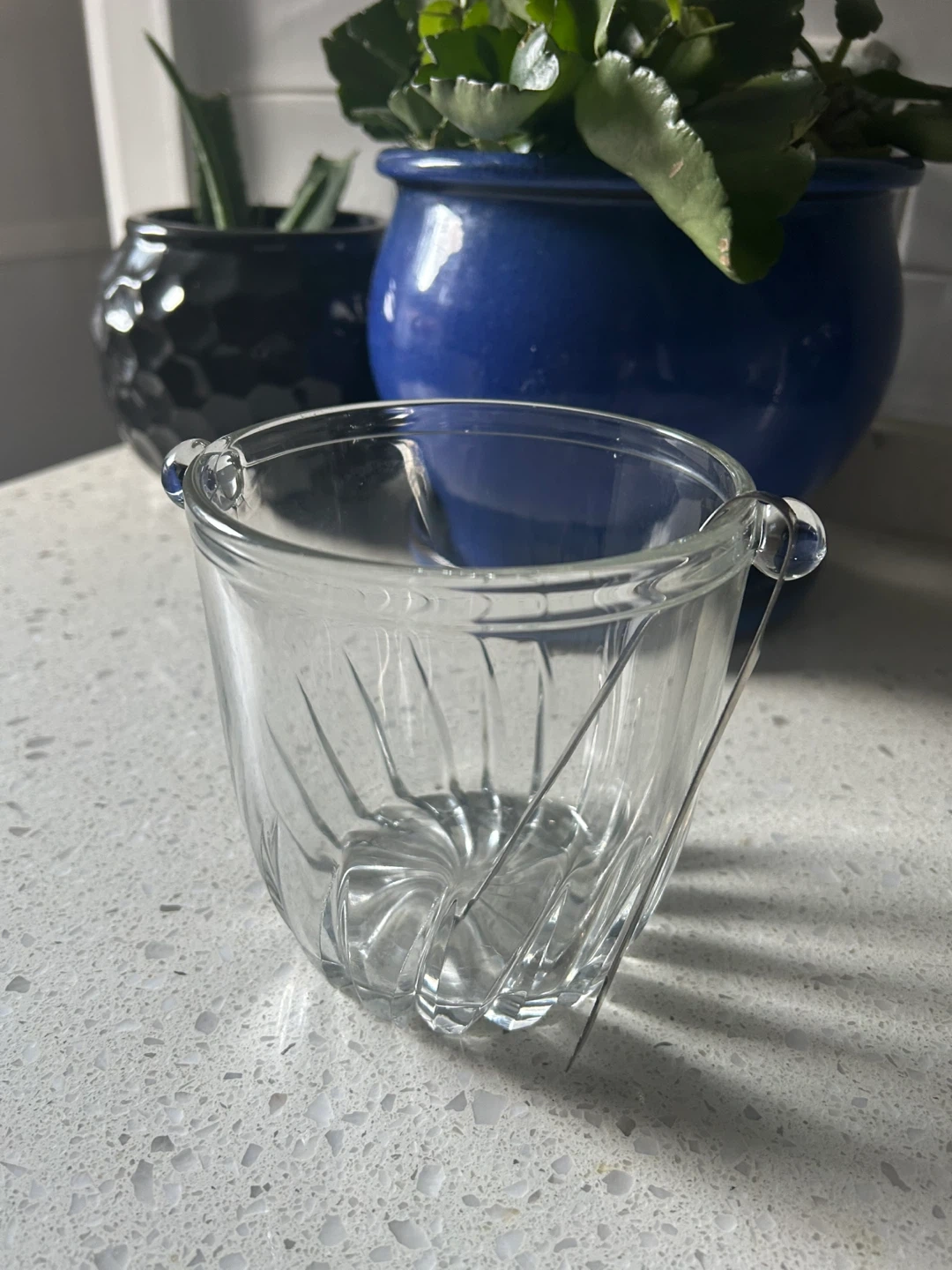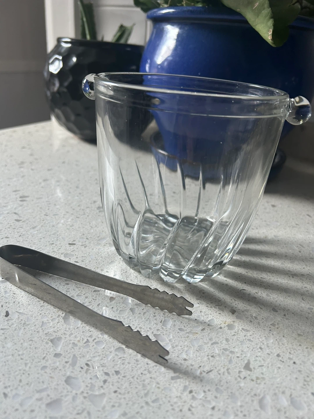 Selling a clear glass ice bucket with silver tongs. Perfect for keeping your drinks cold during parties or gatherings. It's in great condition and ready for a new home!