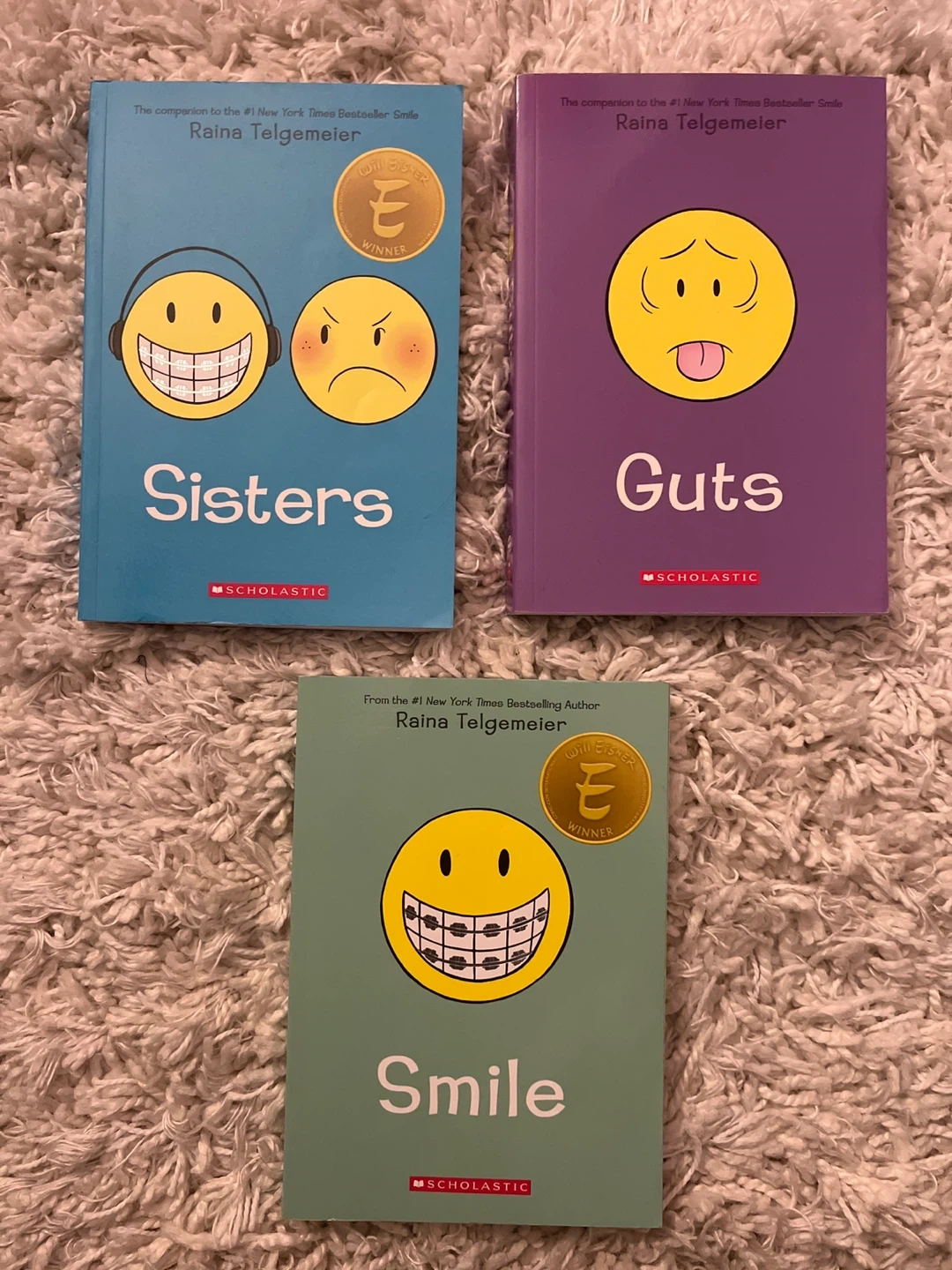 Selling a set of three Raina Telgemeier books: Smile, Sisters, and Guts! These are great reads for kids and teens.