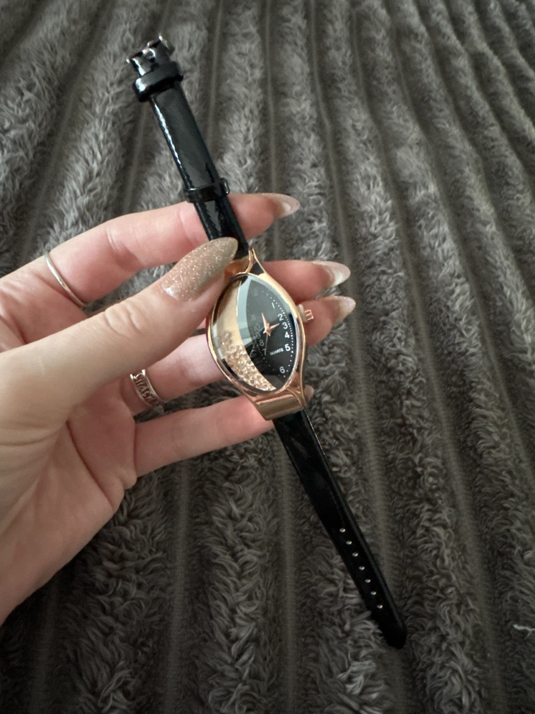 Selling a stylish ladies quartz watch with a sleek black band. It's in great condition and would make a lovely addition to any outfit! The watch features a classic design with a quartz movement for accurate timekeeping