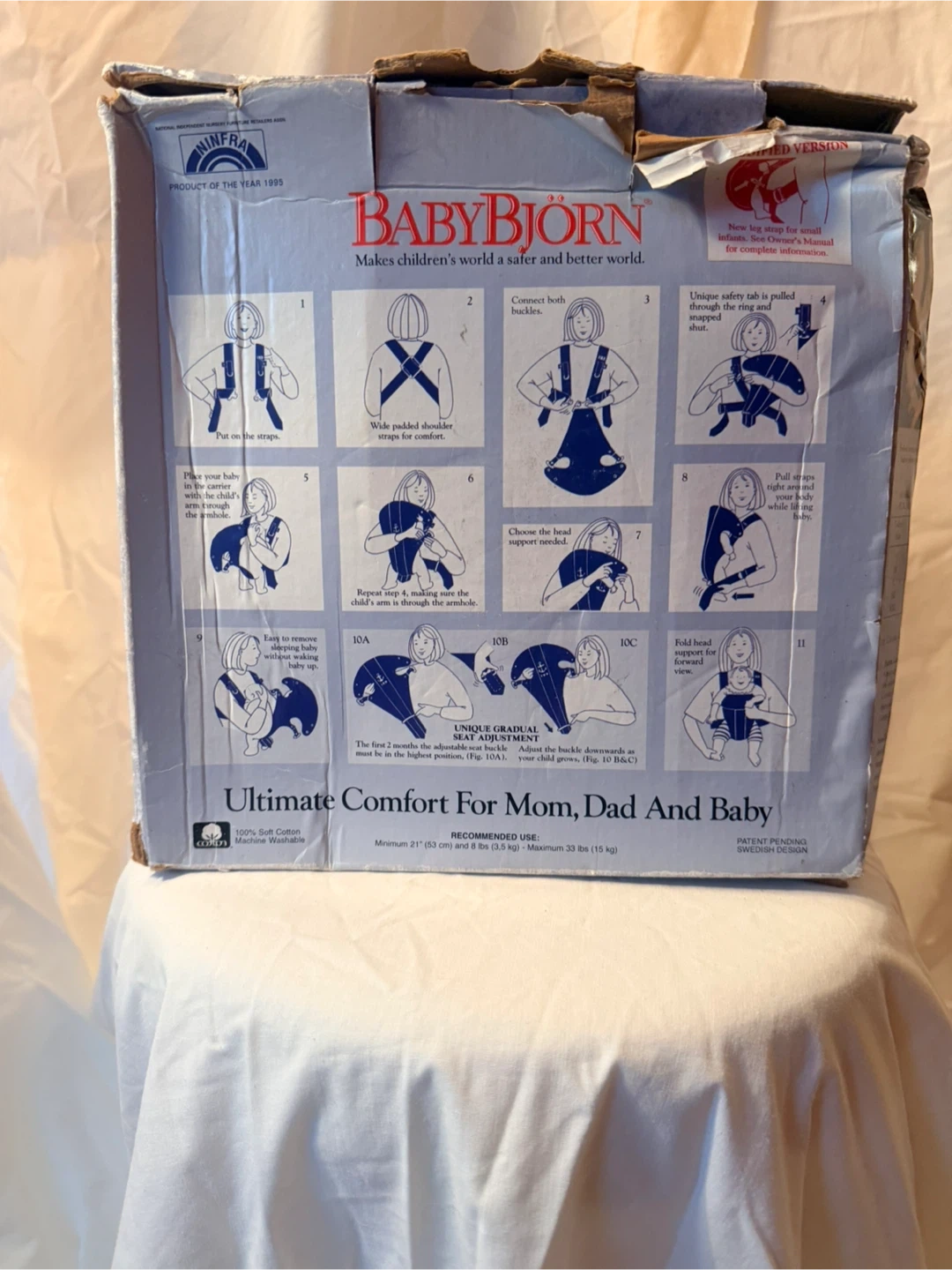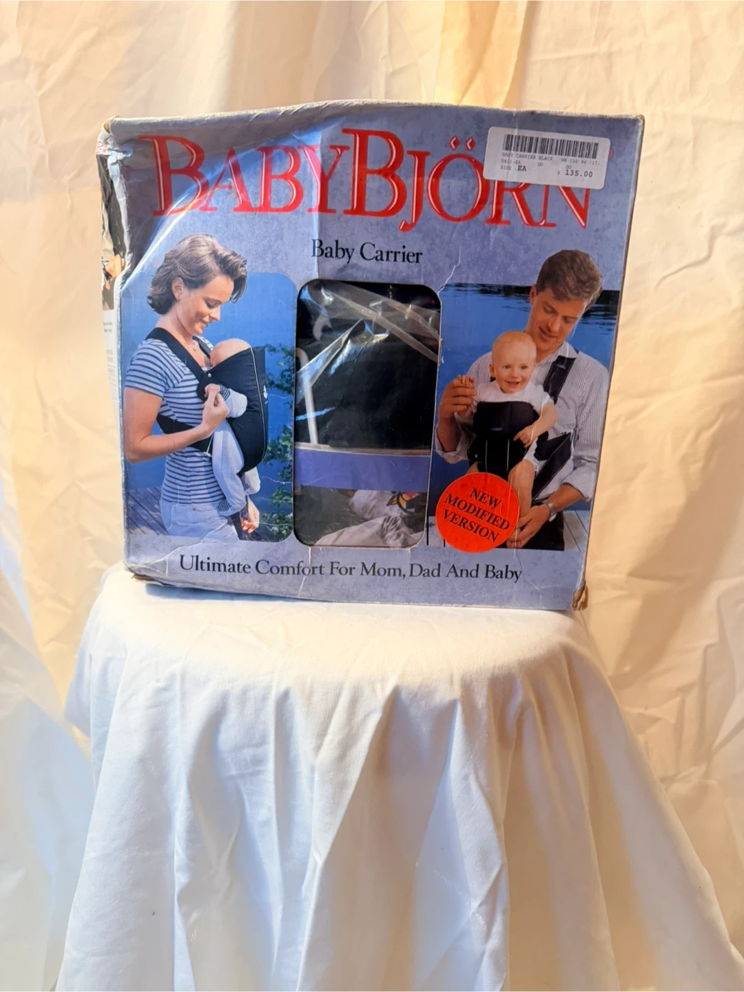 Selling a BabyBjorn baby carrier, new modified version! The box shows how to use the carrier. It's designed for ultimate comfort for mom, dad, and baby. Recommended for babies between 21" (53 cm) and 33 lbs (15 kg).