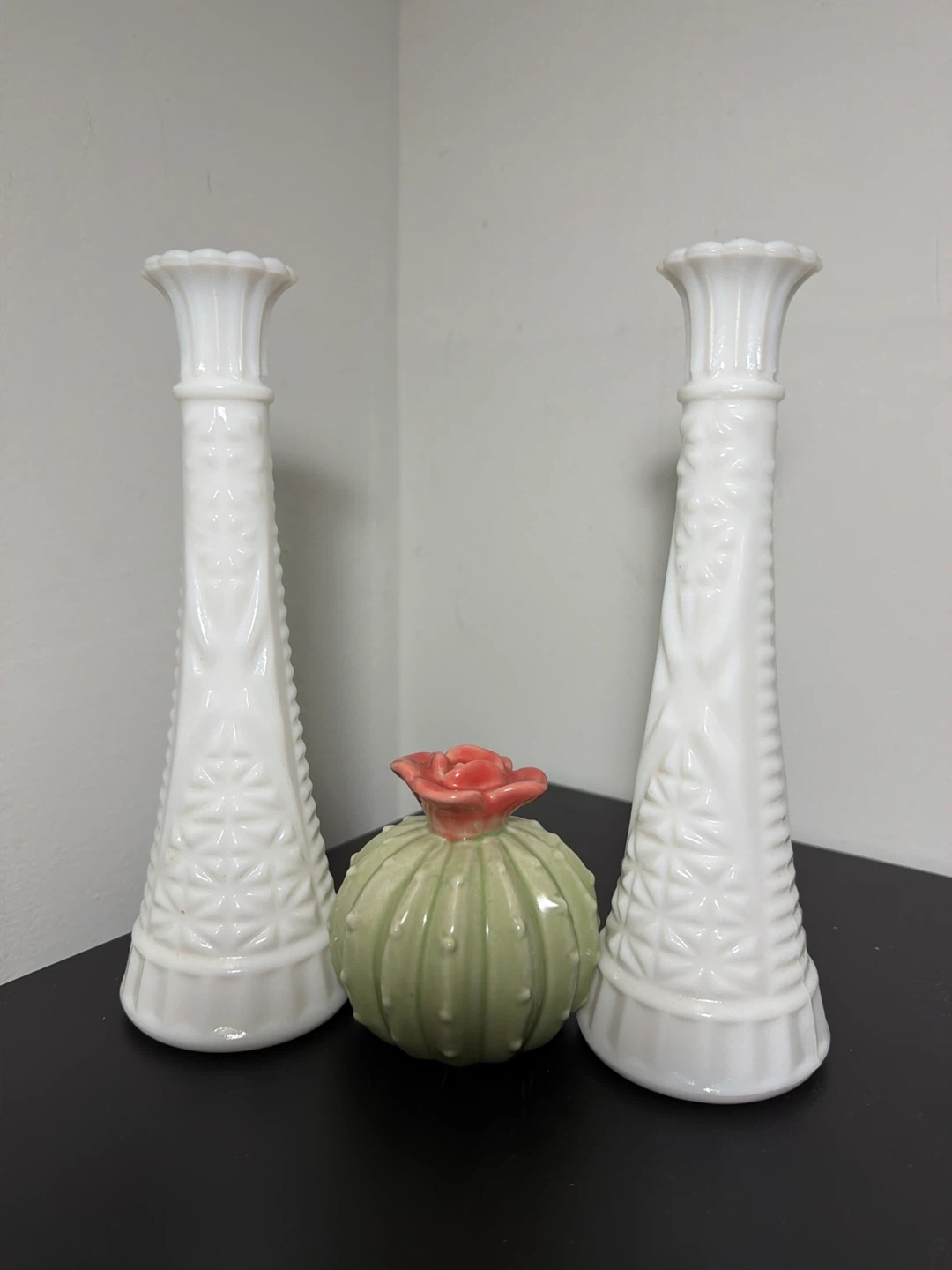 Selling a set of two milk glass vases and a cute cactus decor piece! They're in great condition and would look lovely in any room. Perfect for adding a touch of vintage charm to your home