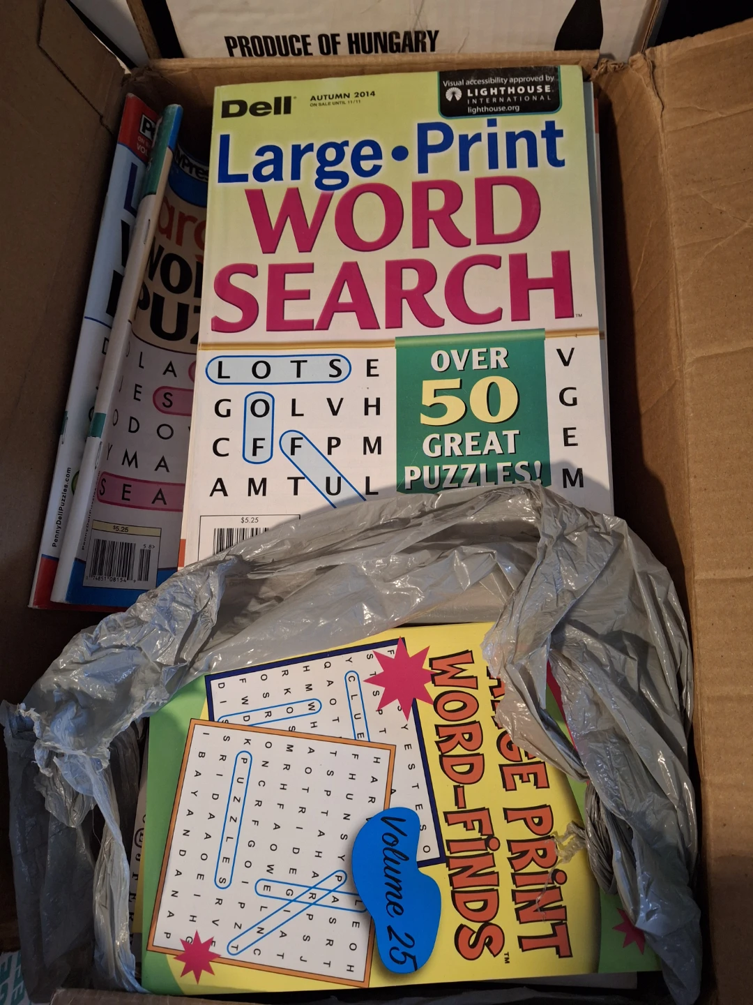 Pickup old stoney creek. New word search books. 25 units. Some large and large print. Some smaller size. Selling as a batch. Price is for entire box.