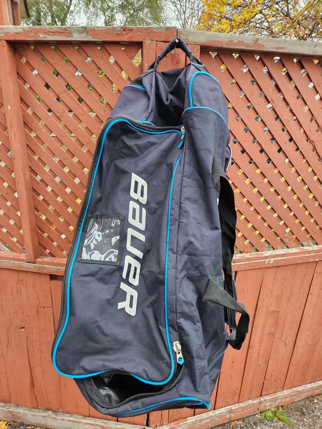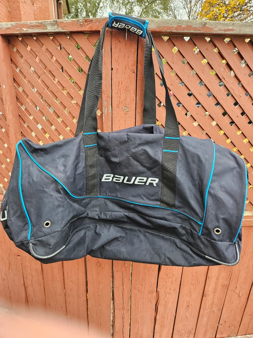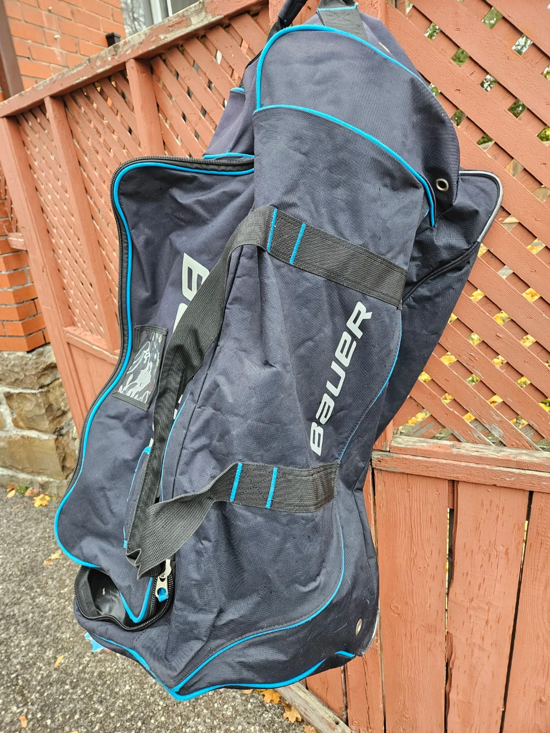 Selling a used Bauer hockey equipment bag in blue and black. It has some wear and tear, but still has lots of life left. Perfect for carrying your gear to the rink!