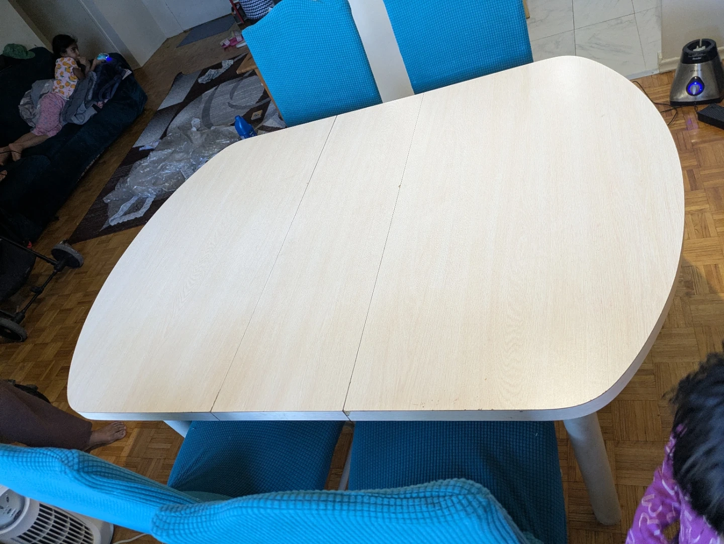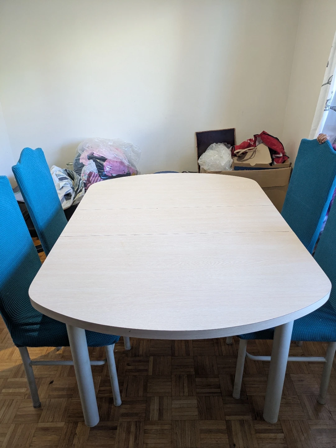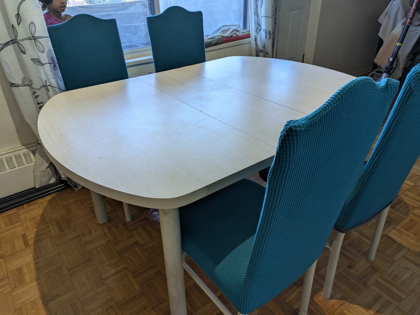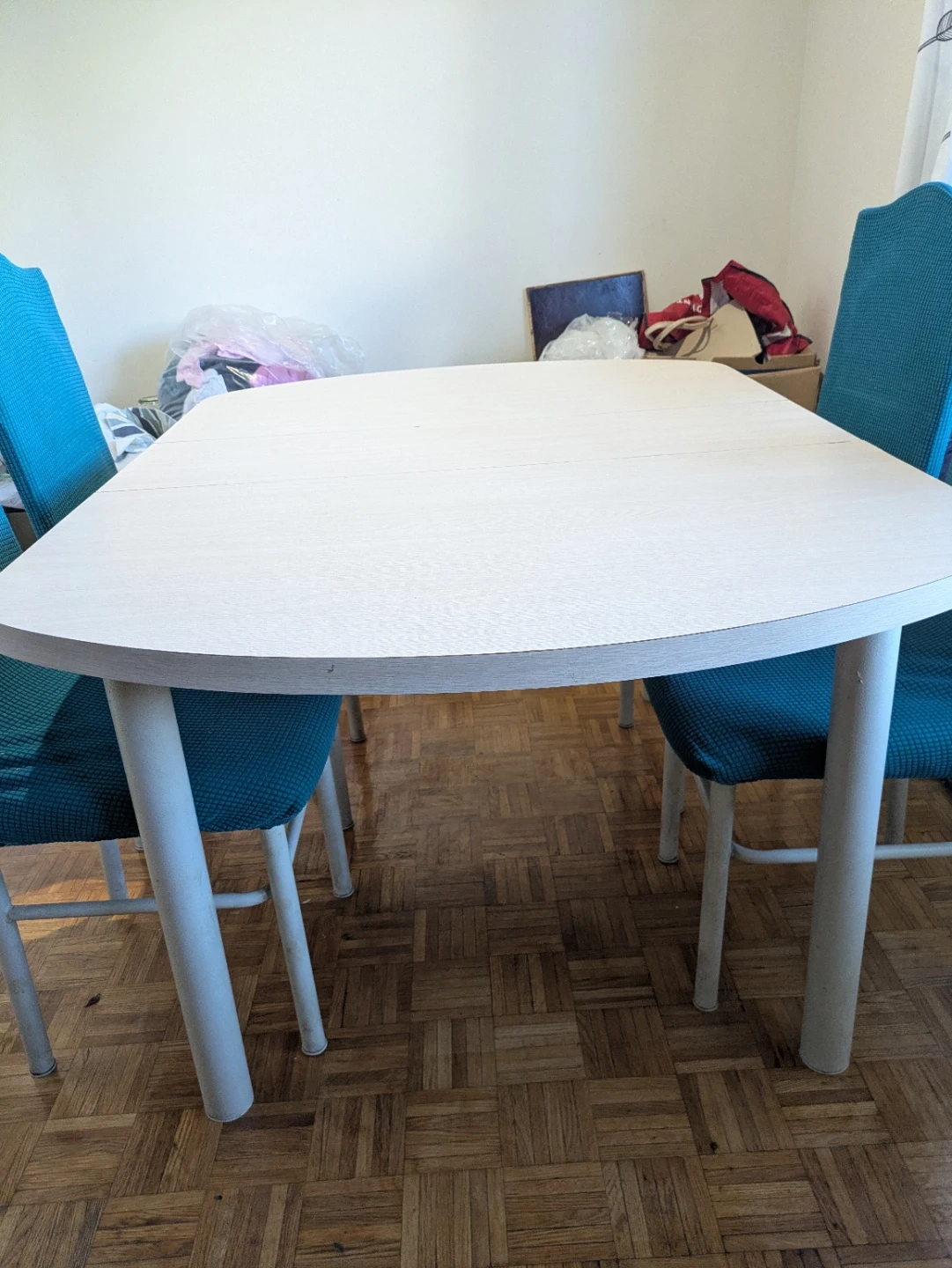 - Great quality, smooth mechanism, minimal wear, easy to clean. Includes 4 turquoise stretch chair covers. Pickup only!