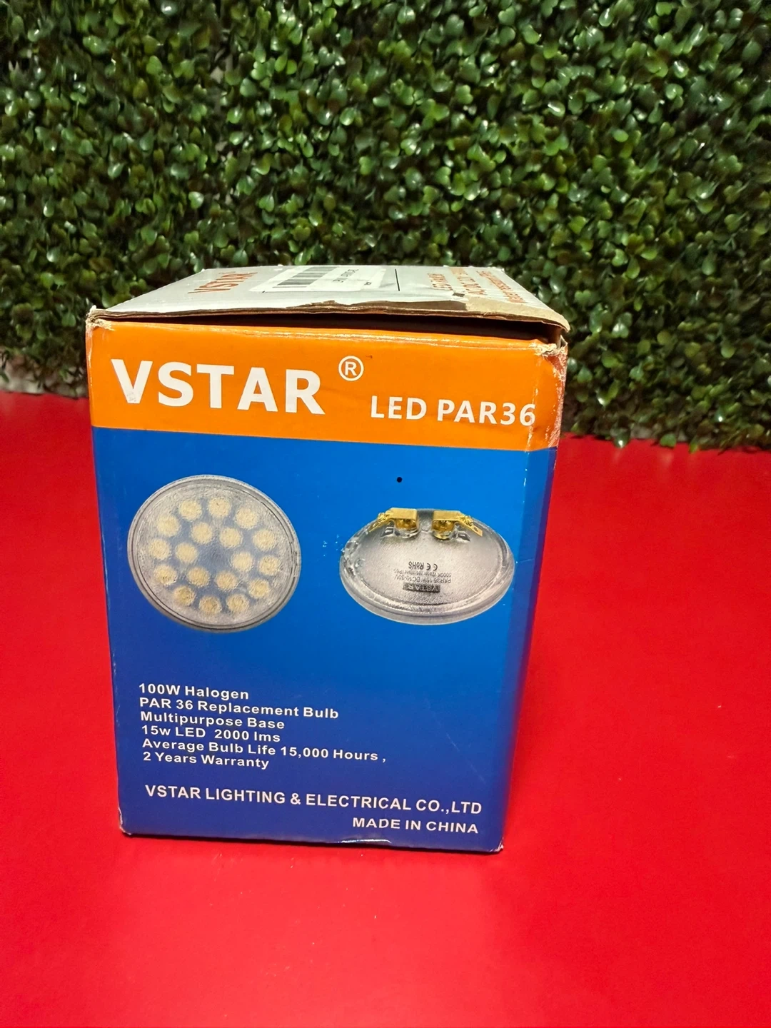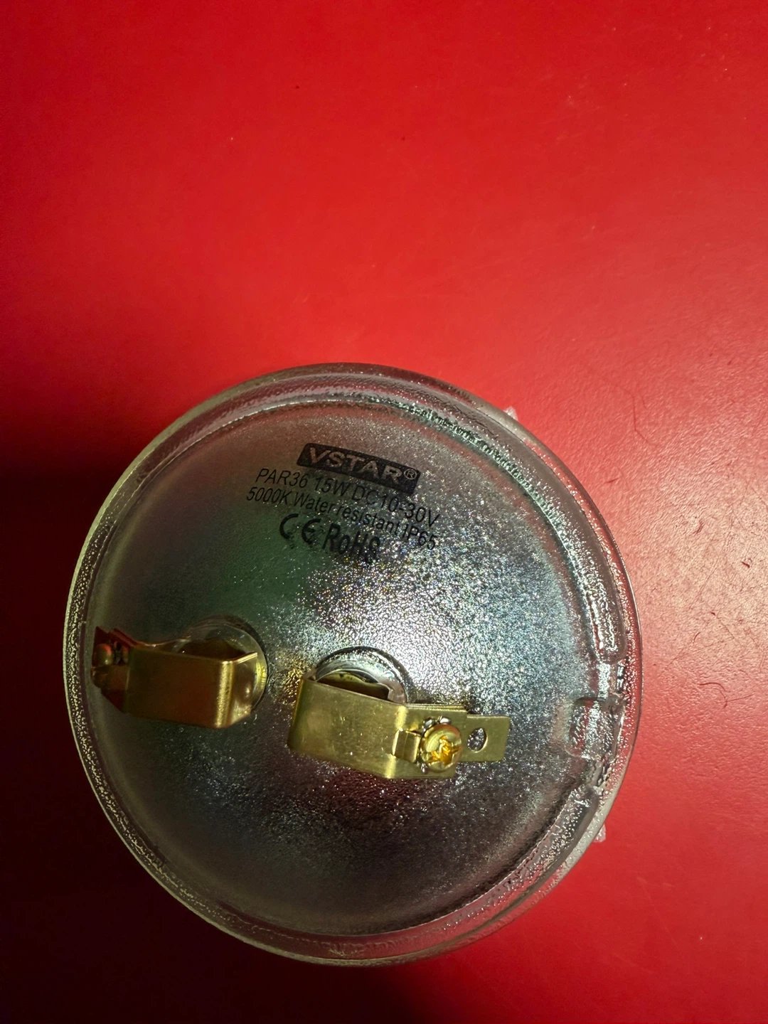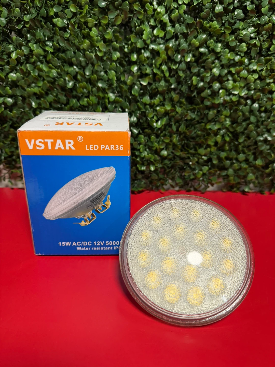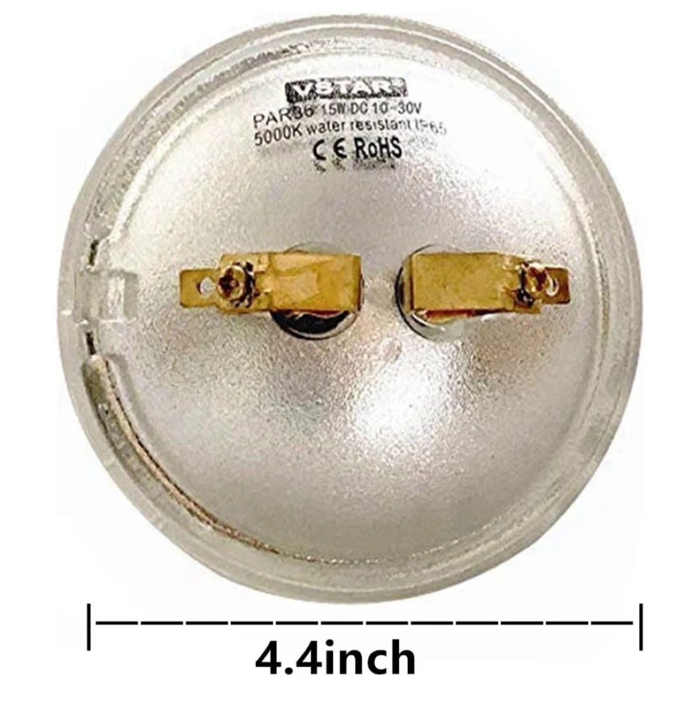 Selling a VSTAR LED PAR36 light bulb. It is water resistant and has a 5000K rating. The bulb is 4.4 inches in diameter and operates on 15W AC/DC 12V. It comes with the original box!