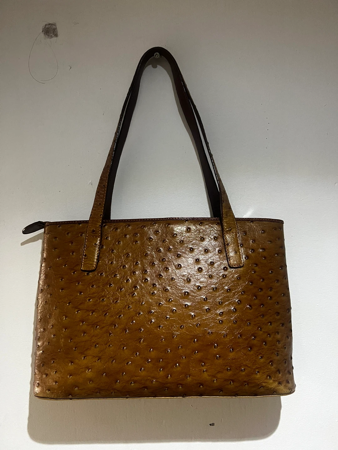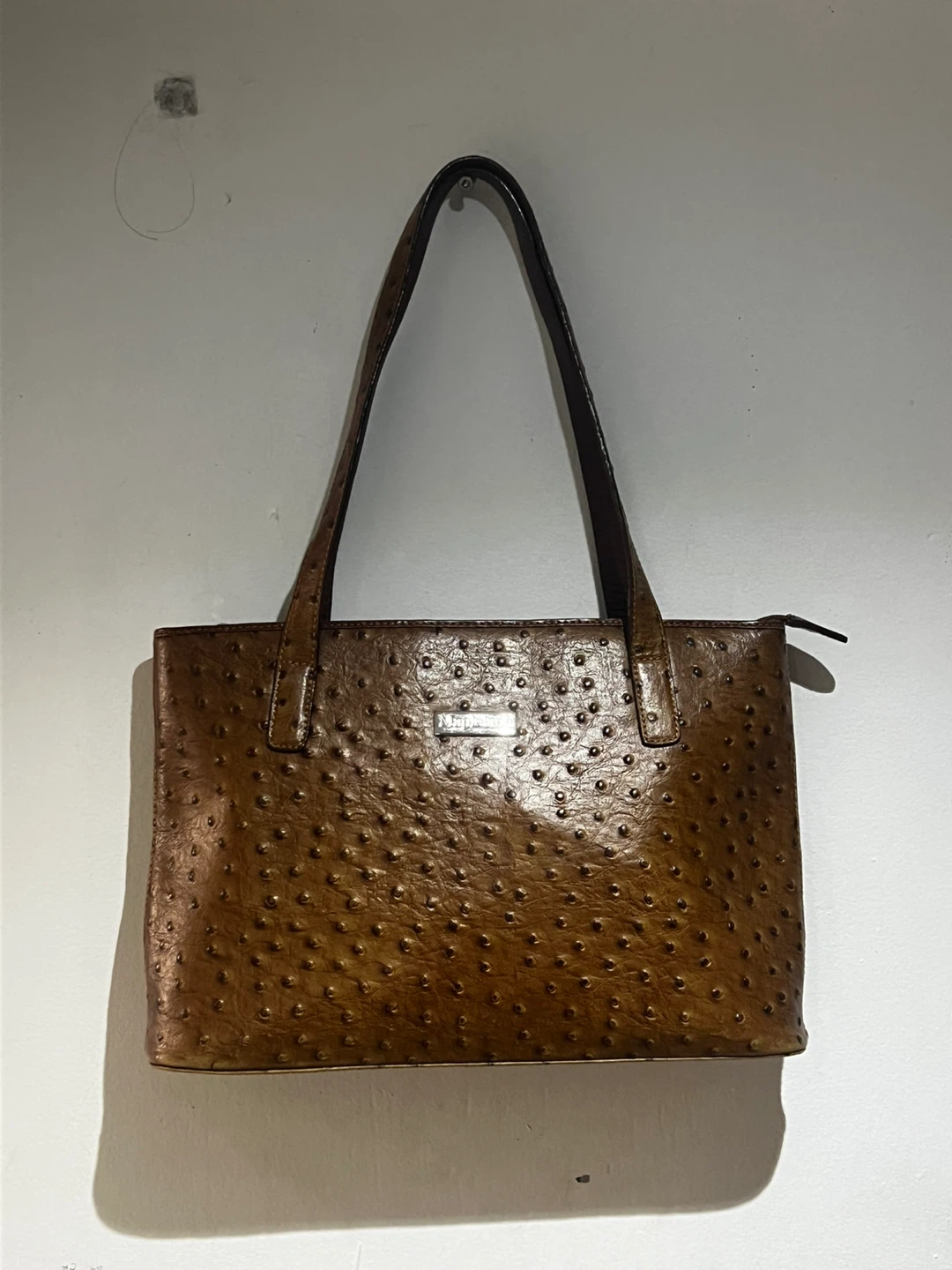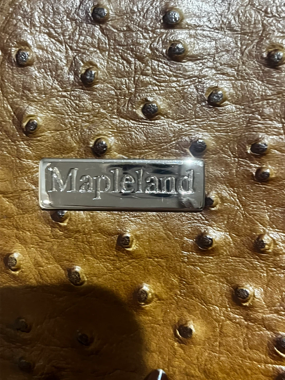 Selling a Mapleland tote bag in a unique brown ostrich leather! This stylish bag is perfect for everyday use. It has a classic design with sturdy handles and a spacious interior.