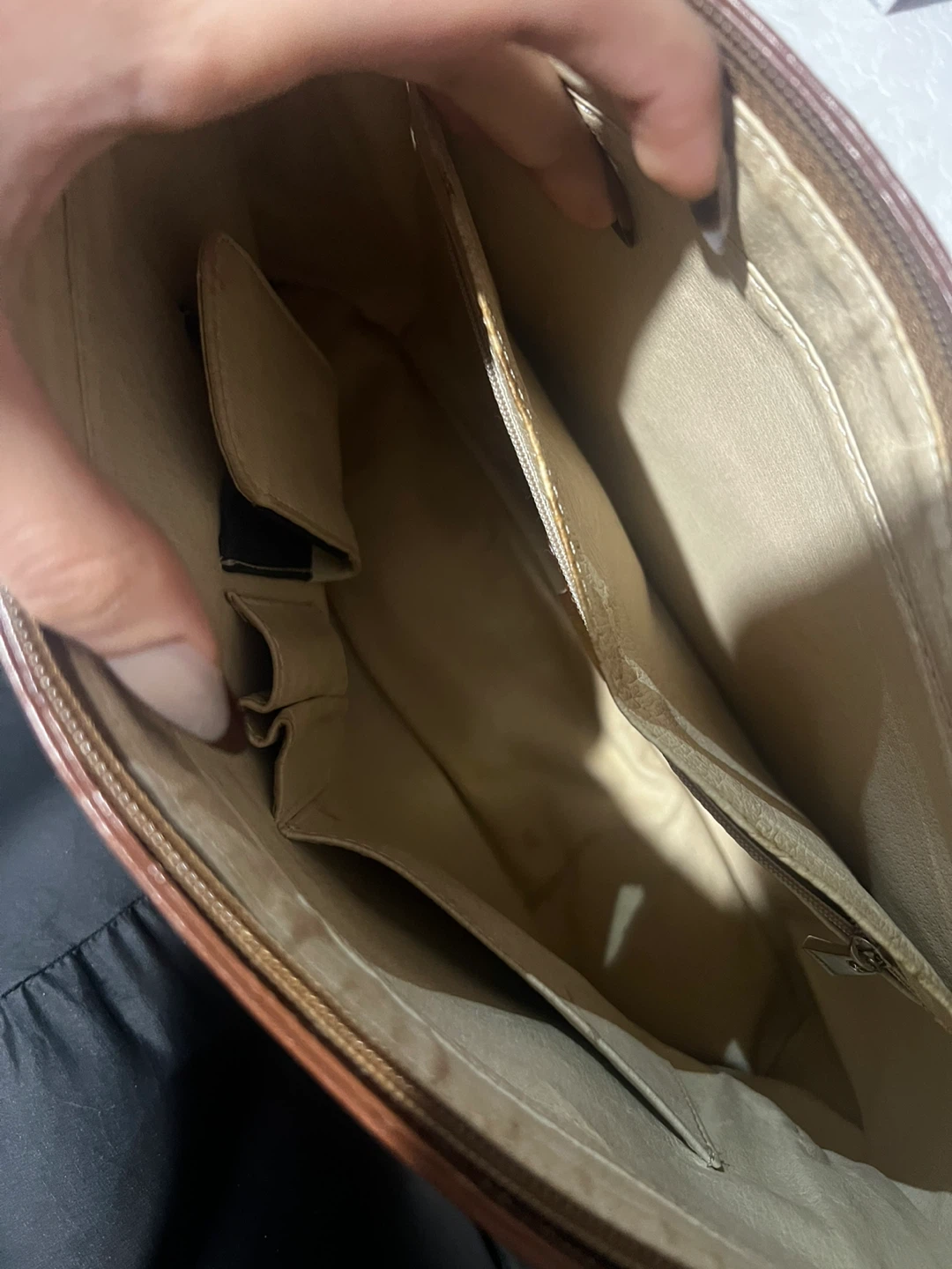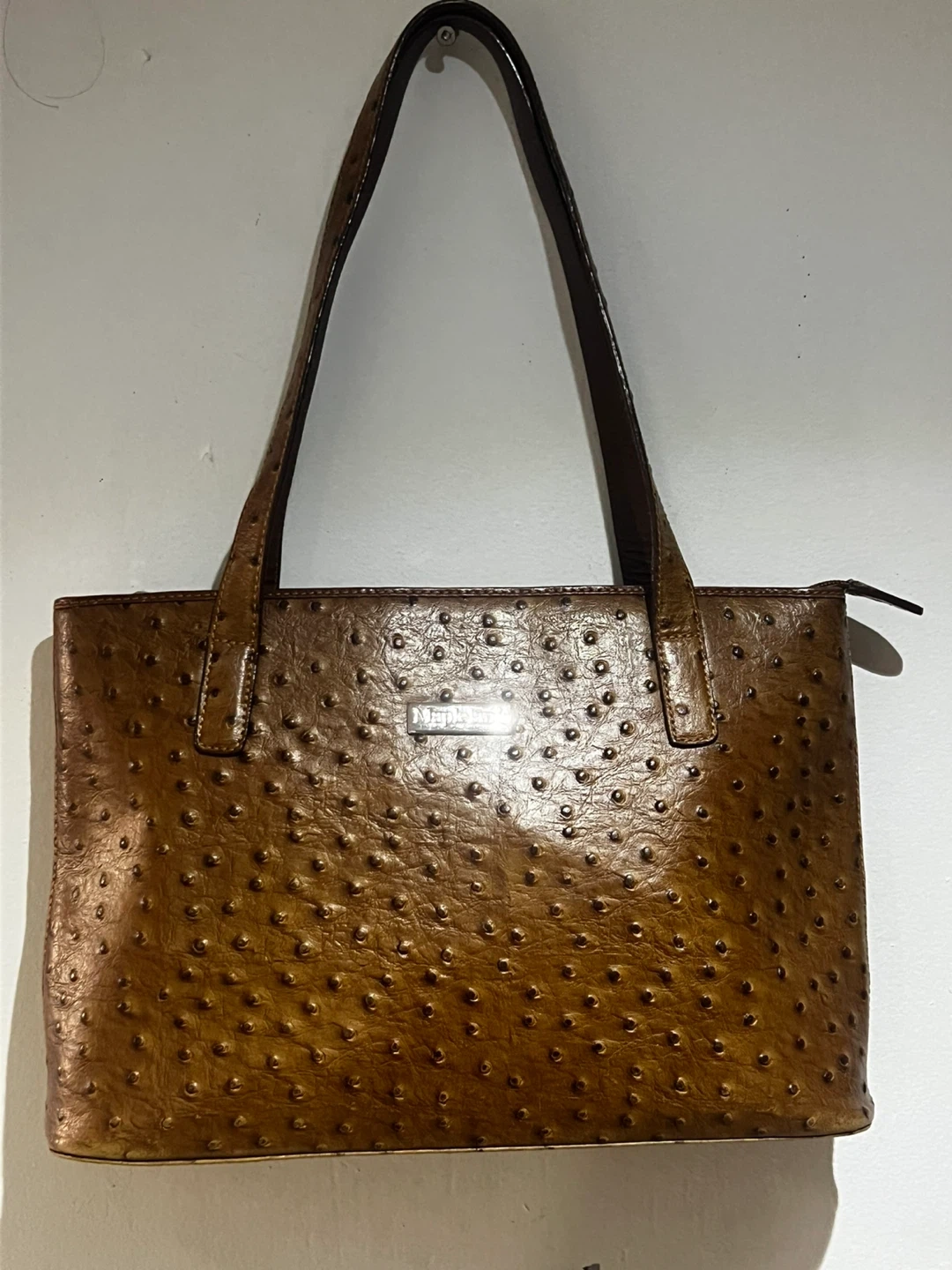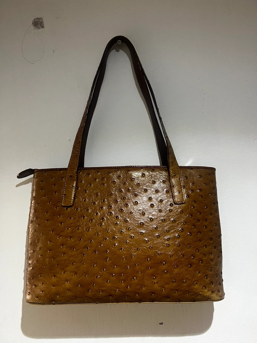 Selling a Mapleland tote bag in a unique brown ostrich leather! This stylish bag is perfect for everyday use. It has a classic design with sturdy handles and a spacious interior.