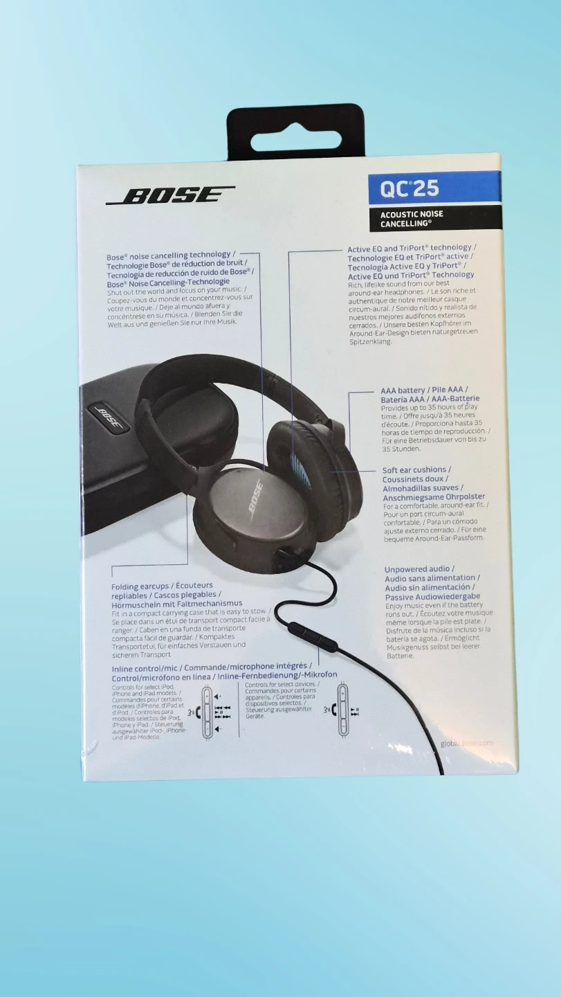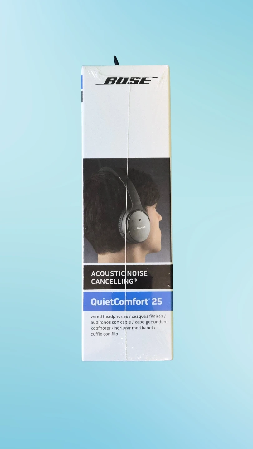 Selling a pair of Bose QuietComfort 25 wired headphones! These headphones feature acoustic noise cancelling technology for an immersive listening experience. They also have soft ear cushions for comfortable, around-ear fit. The folding earcups make them easily portable. Includes inline mic/remote for convenient control of music and calls.