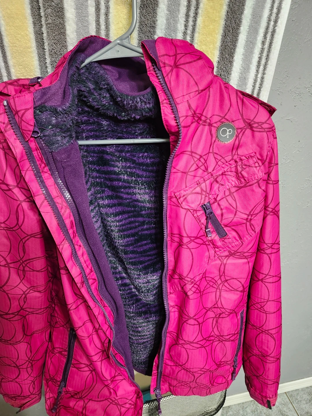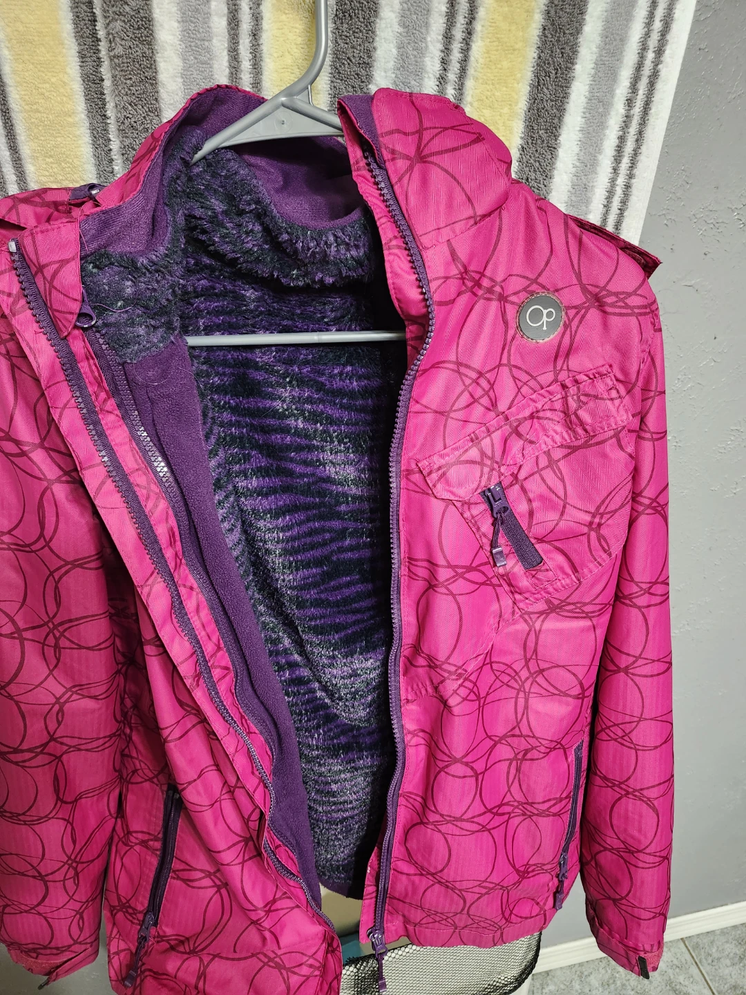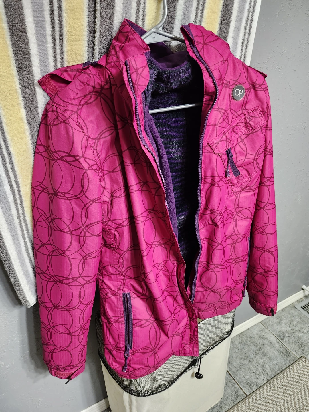 Selling a like new teens / womens winter jacket! It's pink with a purple lining thats removeable and the hood can also be removed to be worn as a spring jacket.Barely worn like new.Excellent condition.
