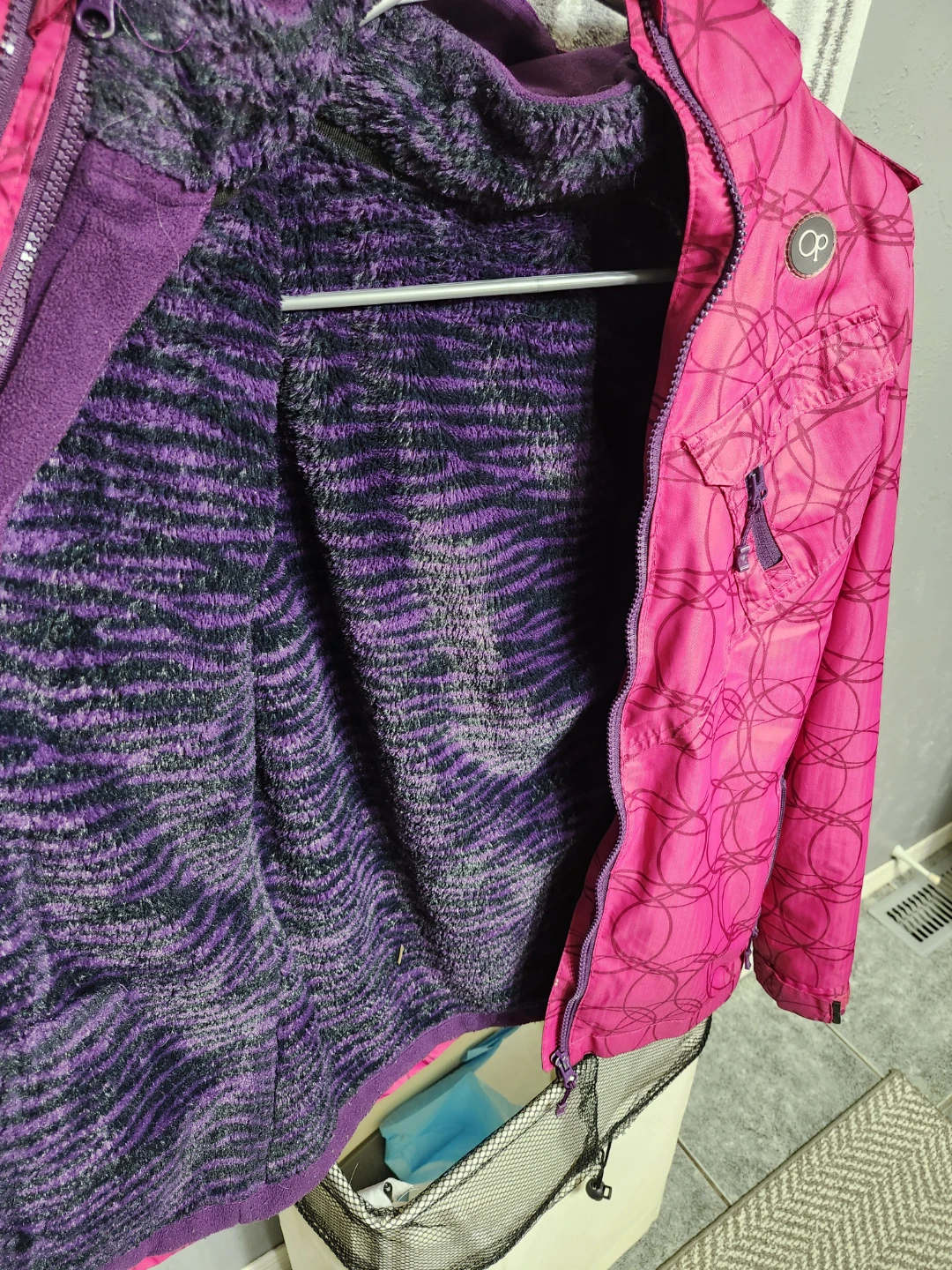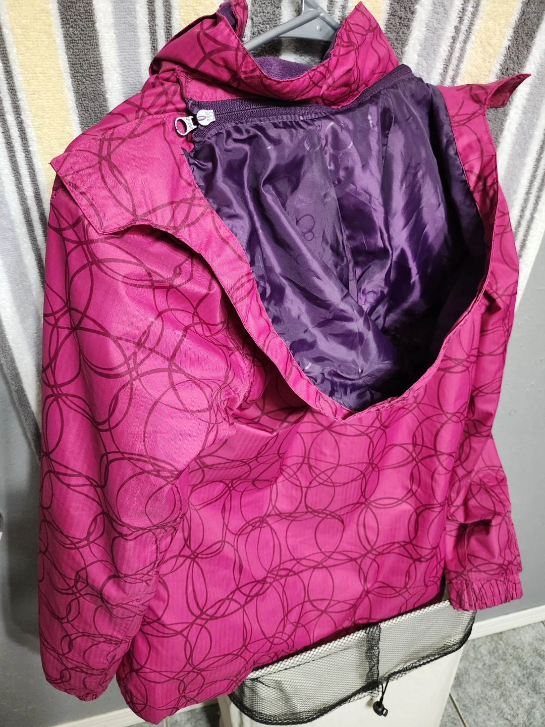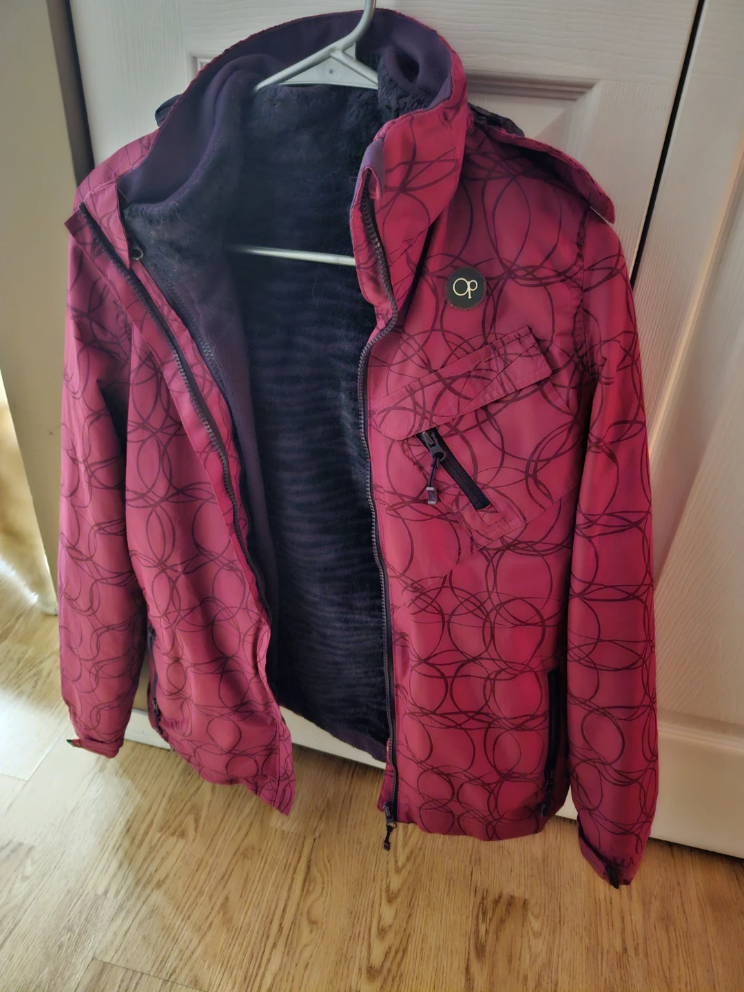 Selling a like new teens / womens winter jacket! It's pink with a purple lining thats removeable and the hood can also be removed to be worn as a spring jacket.Barely worn like new.Excellent condition.