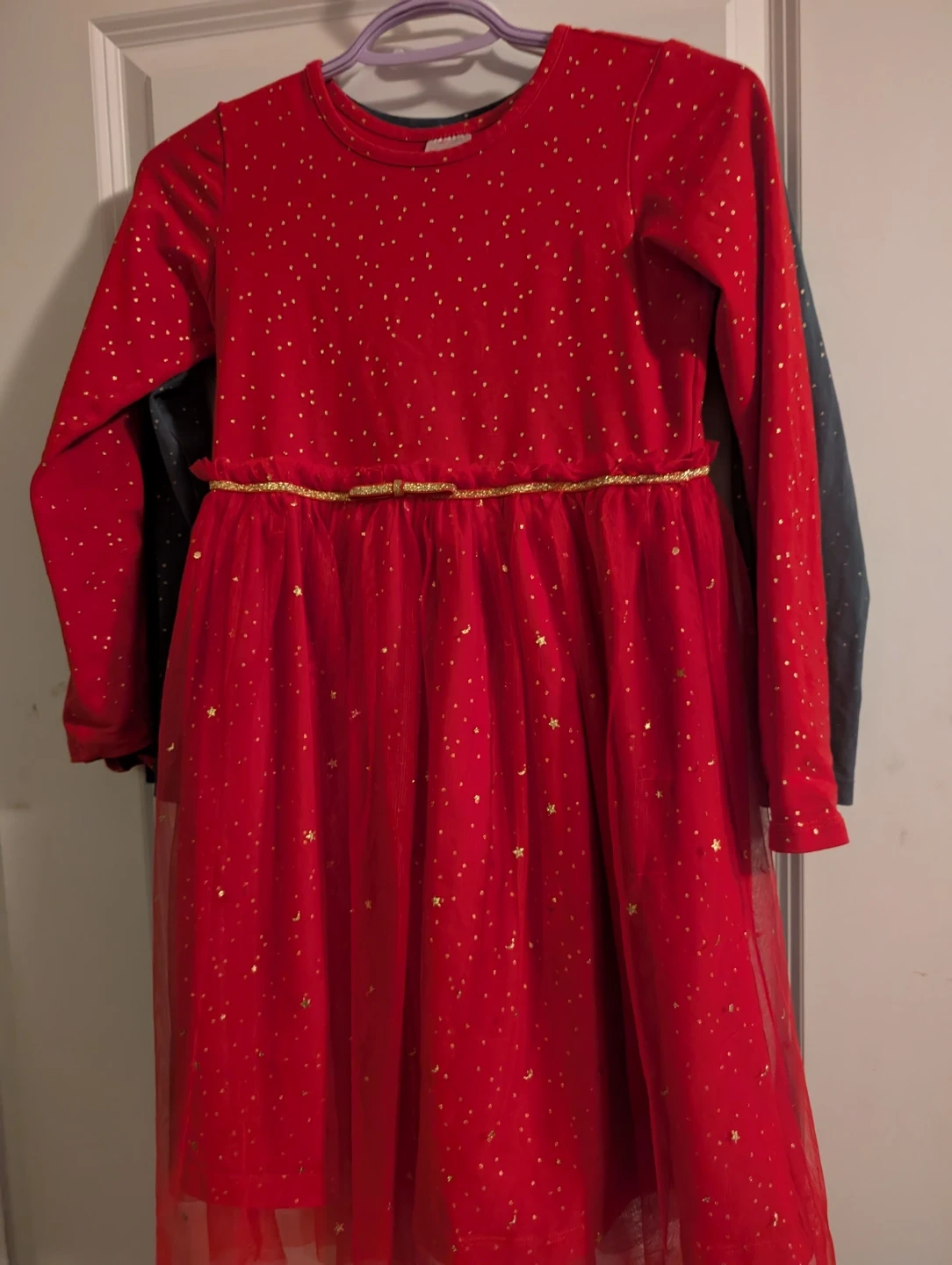 A cute red dress with gold sparkles! It features long sleeves and a tulle skirt. Perfect for parties or dressing up!