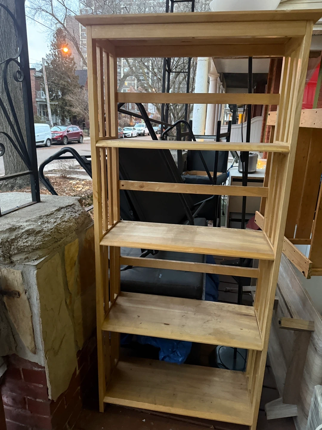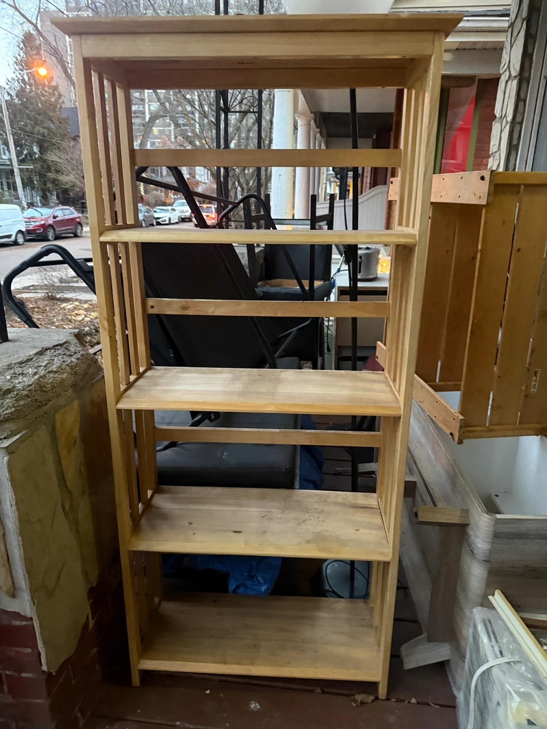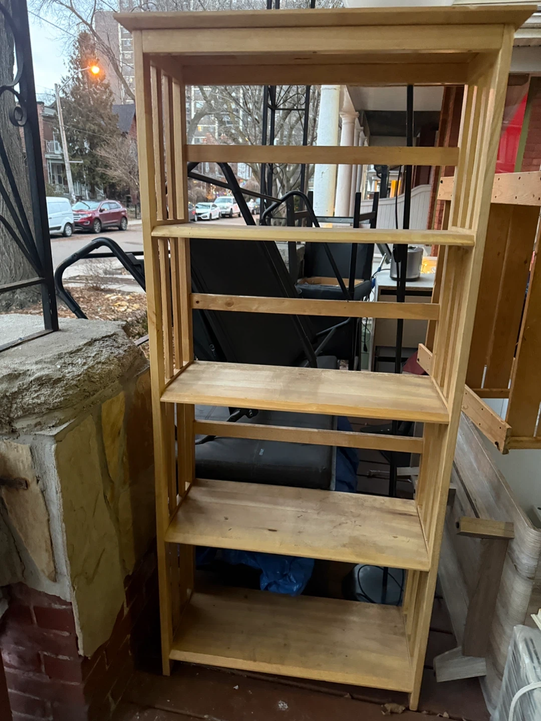 Here's a wooden shelf that could be perfect for your home. It's in good condition and ready to use. It's a great way to add some storage and style to any room