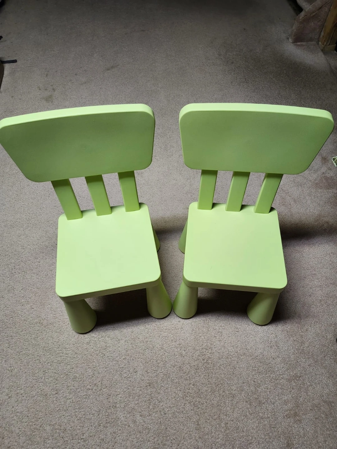 Selling a pair of light green IKEA Mammut chairs for kids! These are super durable and easy to clean, perfect for little ones. Great for playrooms or kids' rooms. These are at the grandparents house so they are barely used.