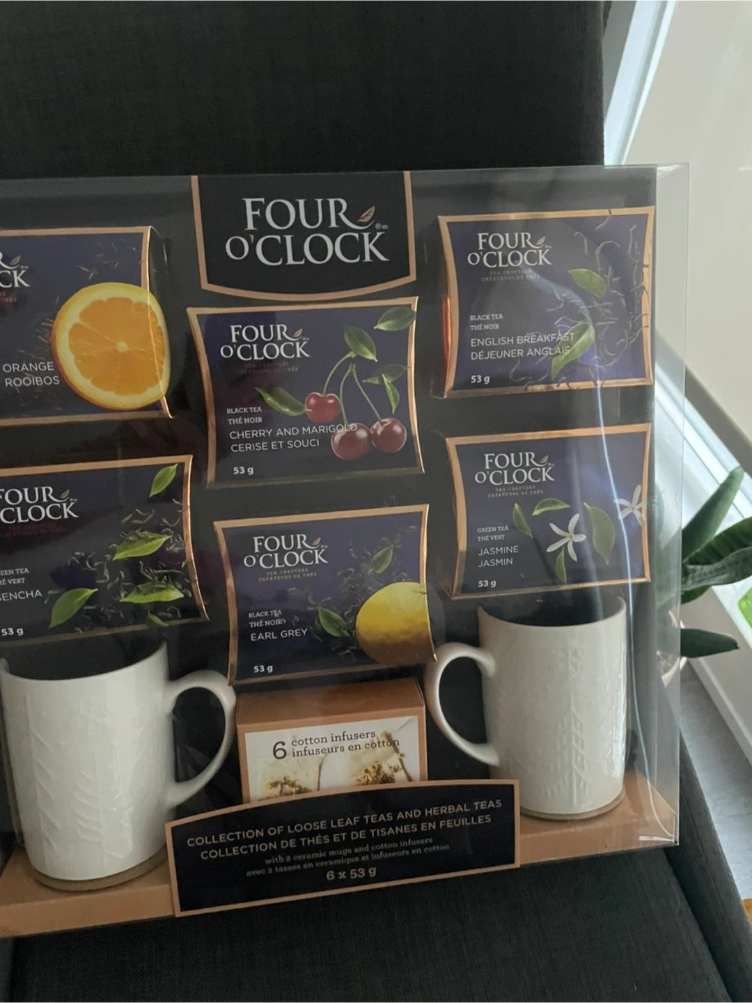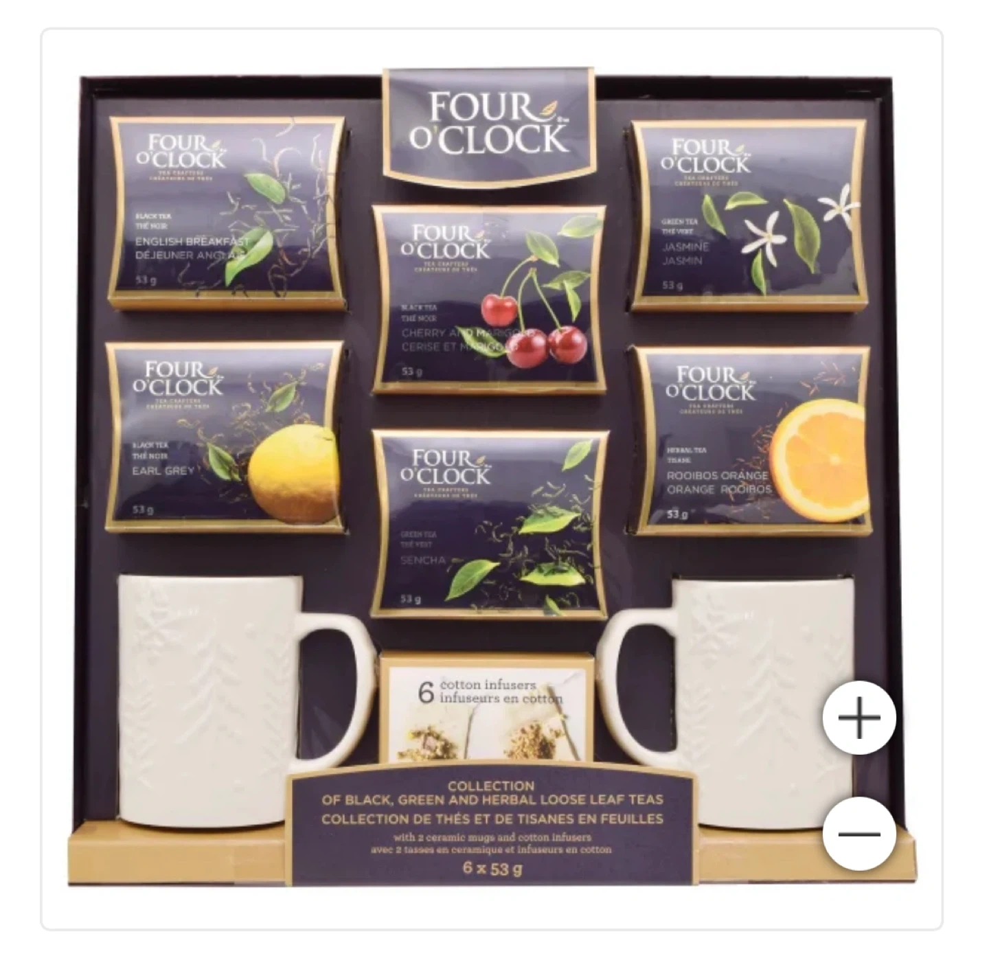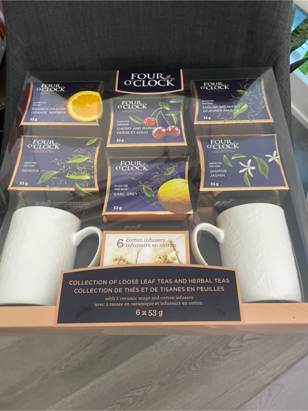 Selling a Four O'Clock Collection of Loose Leaf Teas and Herbal Teas. It includes two ceramic mugs and six cotton infusers. The collection contains 6 x 53g of assorted teas. Perfect for tea lovers!