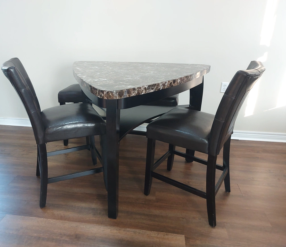 Dining table and chairs like new. 2 chairs and bench. The table has granite like countertop.