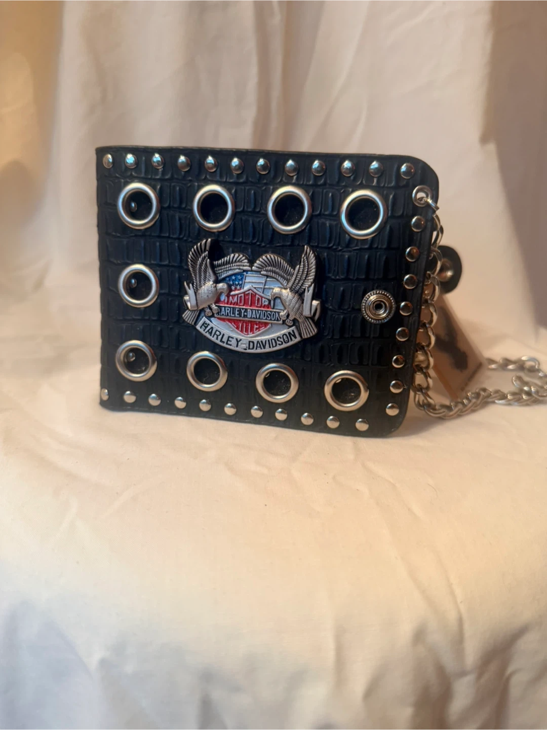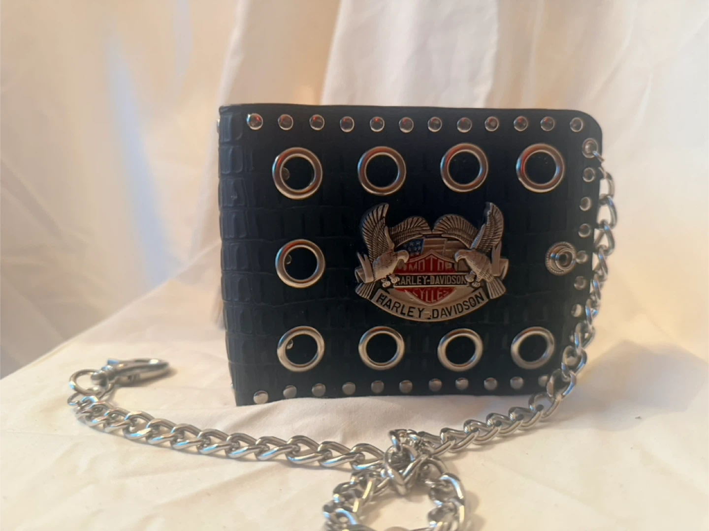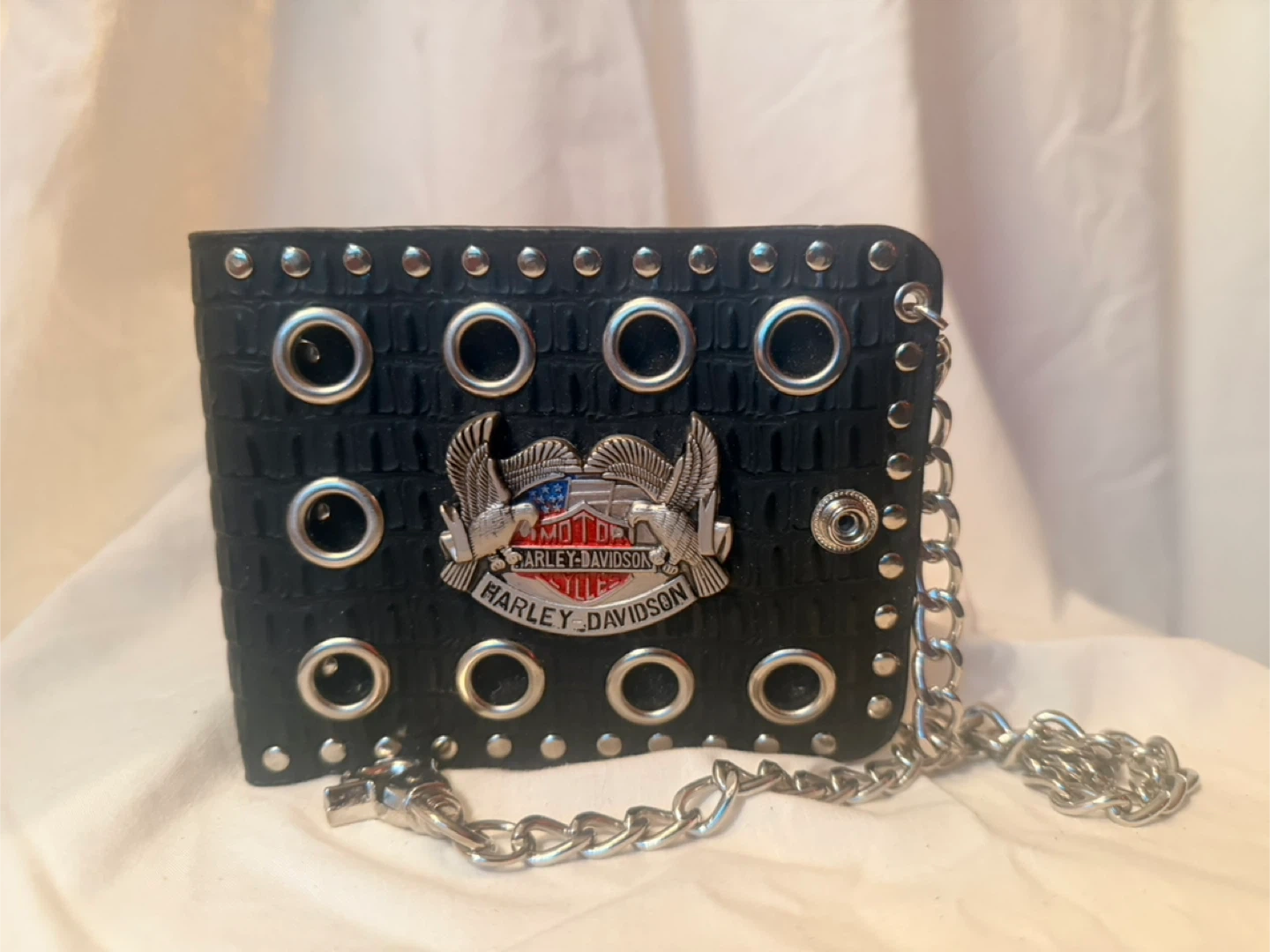 Selling a Harley Davidson black wallet. It features a silver chain and a snap closure. The wallet is in great condition and has a unique design with eyelets and studs.